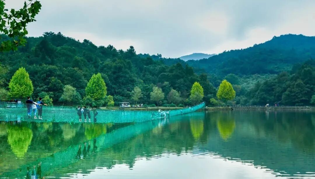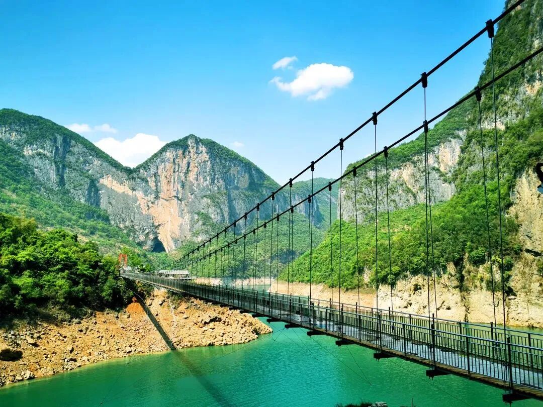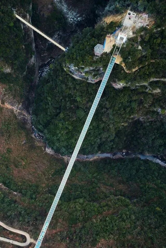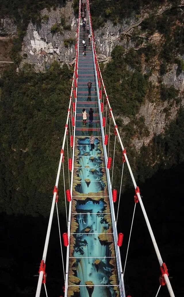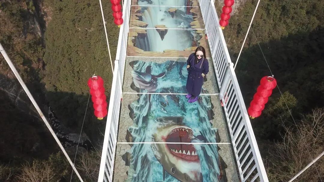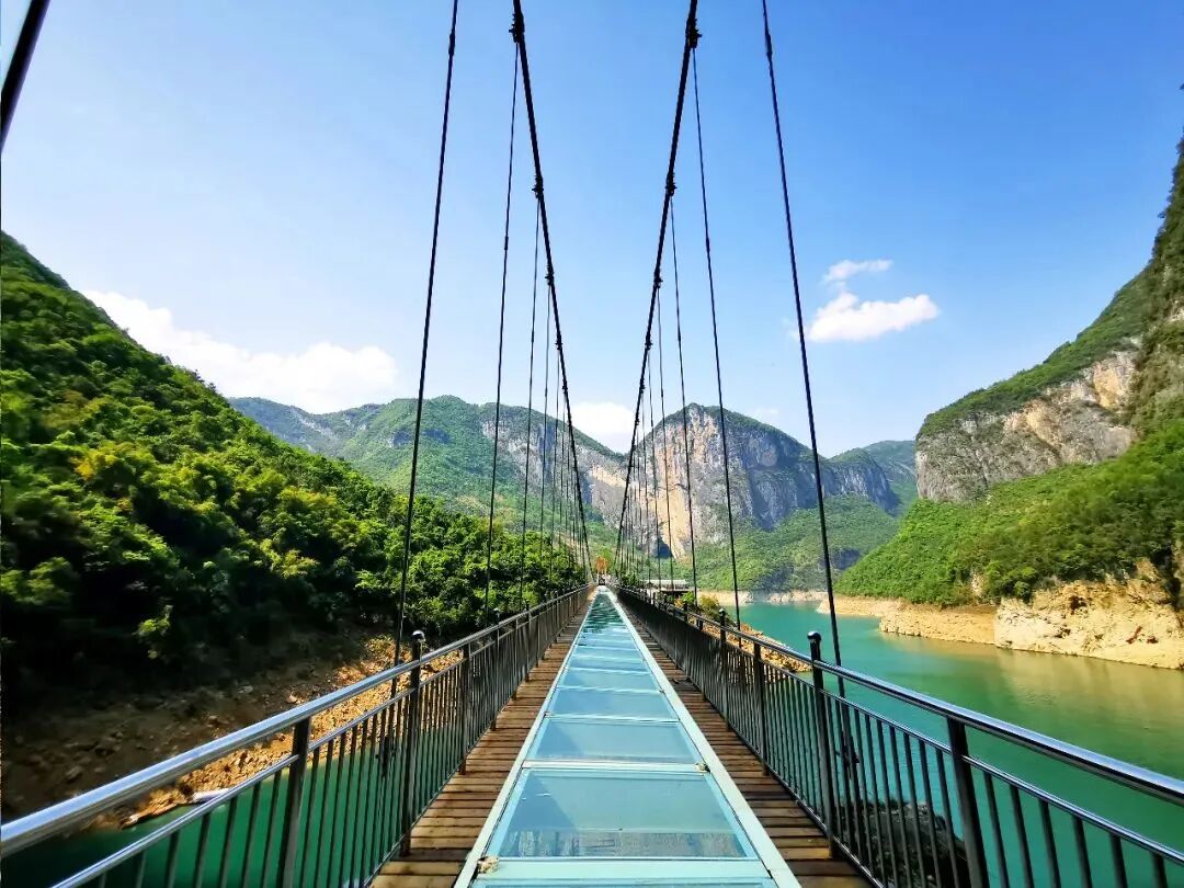 “云之端”石门河地心谷玻璃悬索桥是全国首座峡谷9D玻璃悬索桥,桥长268米,桥面宽3.2米,桥面离河谷高约200米。桥体采用超现实视觉技术,模拟多种特技效果、惊险剧情,让游客全身心融入峡谷天堑的冒险旅途中。(门票80元/人自愿自理)