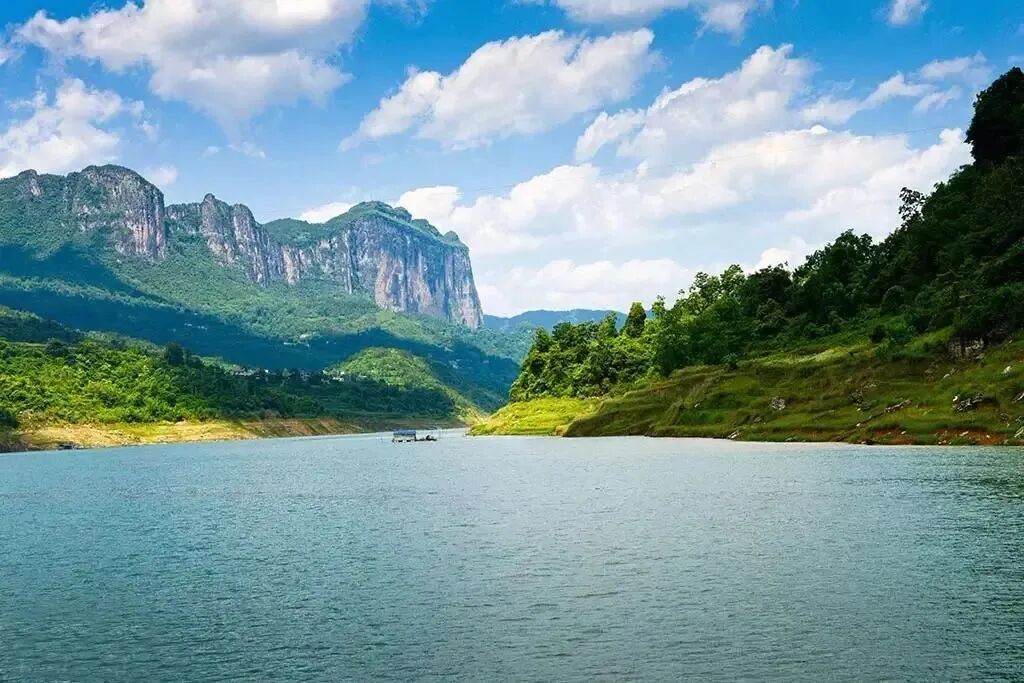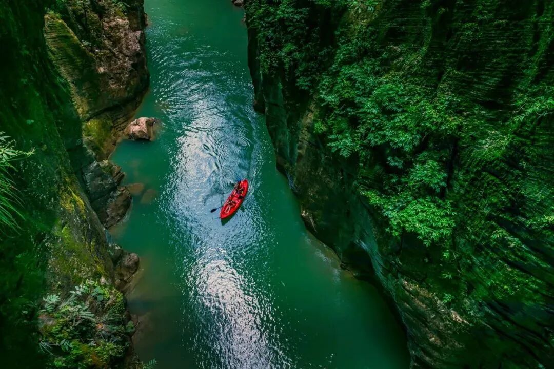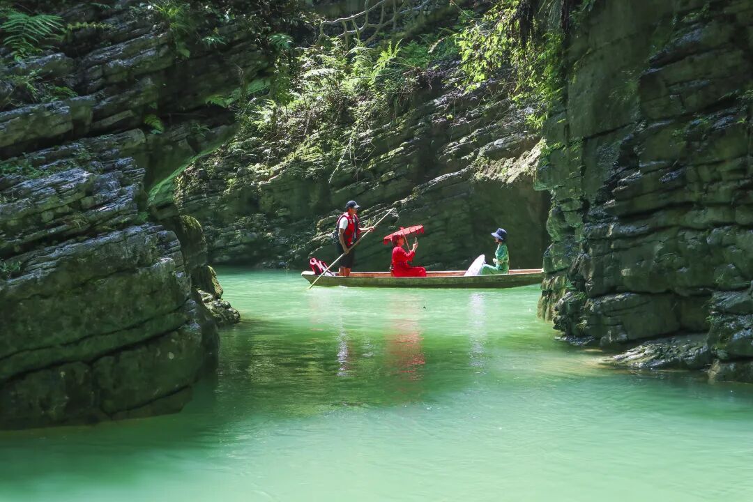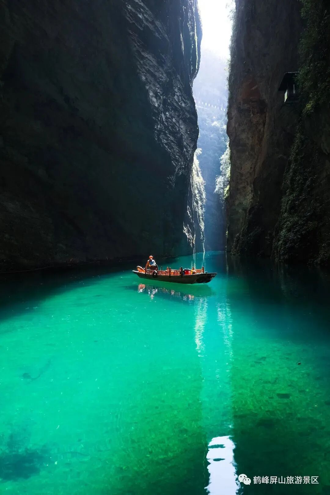 屏山峡谷全长18公里,四周峭壁耸立,集奇、秀、险于一体。山谷地缝移步换景,如穿越时空;舟行绝尘之水,如悬浮浩瀚宇宙。被无数网友赞誉“中国仙本那,世外古桃源”。