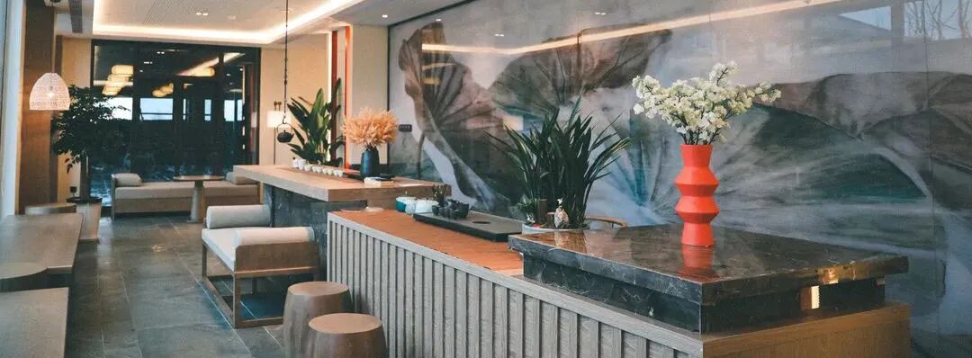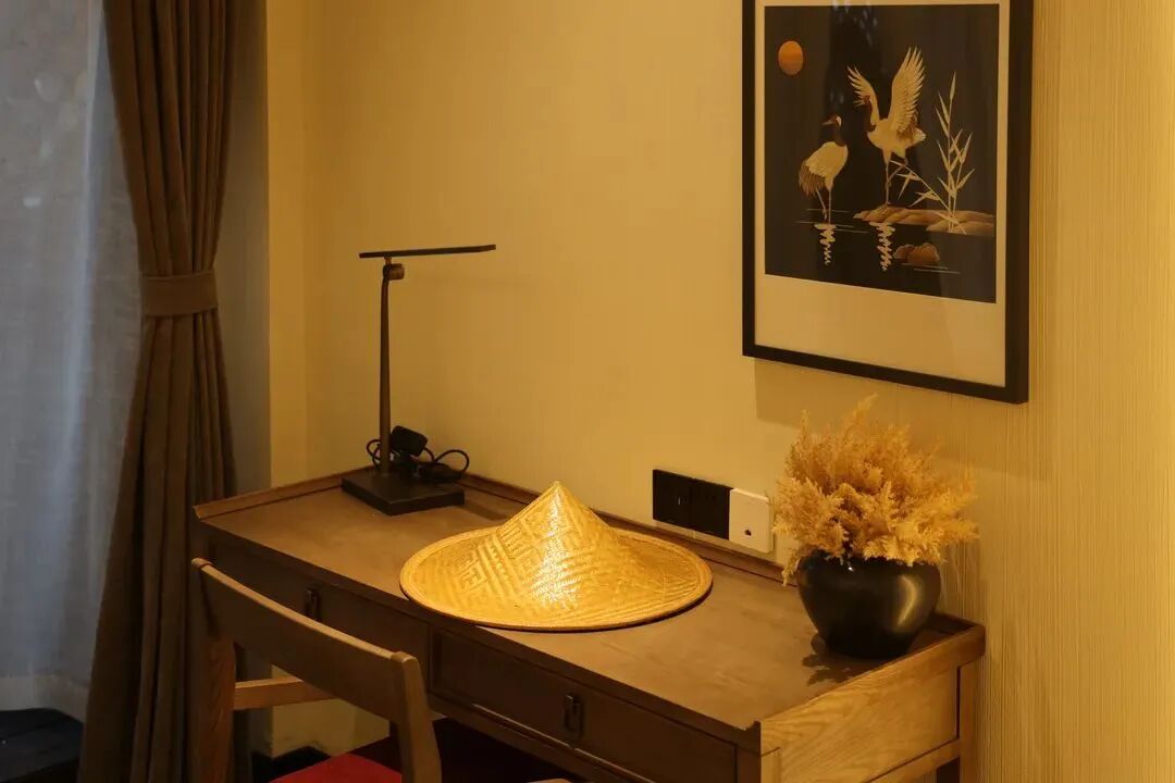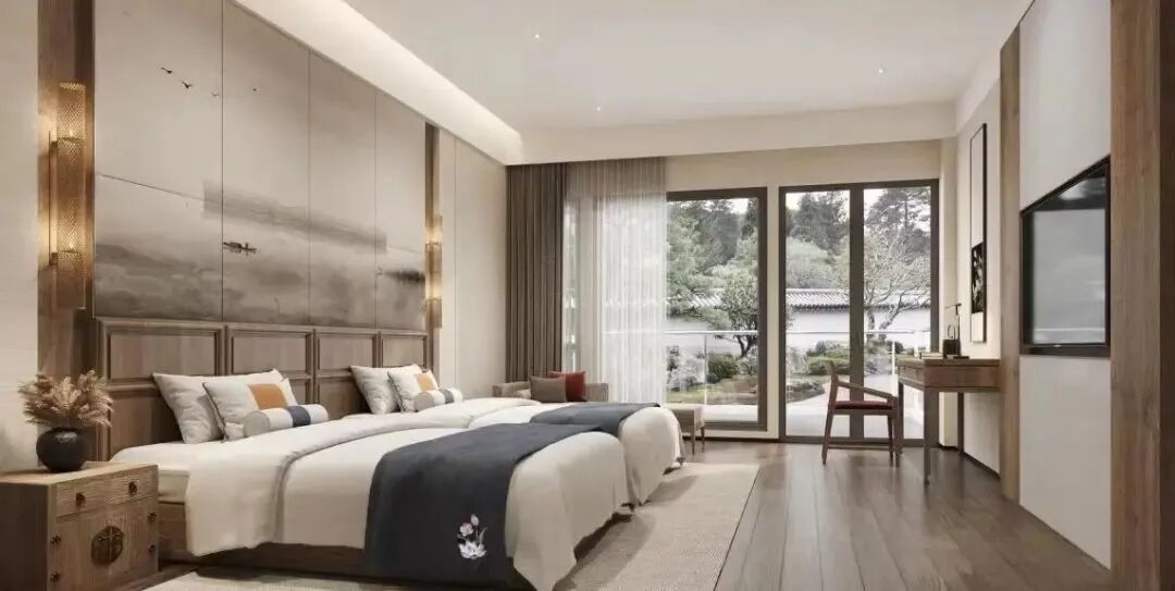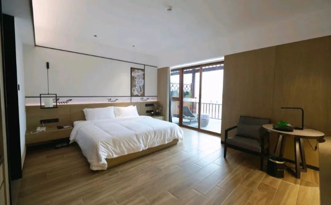 客房灰橙搭配,迷你酒吧、奢华卫浴、景观阳台、房间配套,一应俱全。以国风元素作为点映,床头的壁画、柜子、摆饰,古色古香、宁静致远。