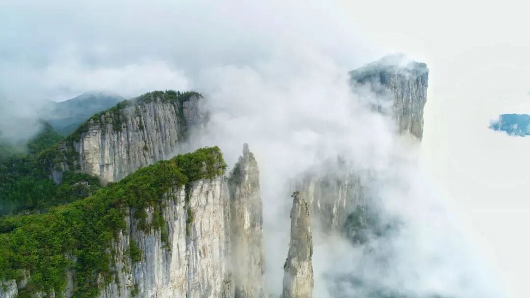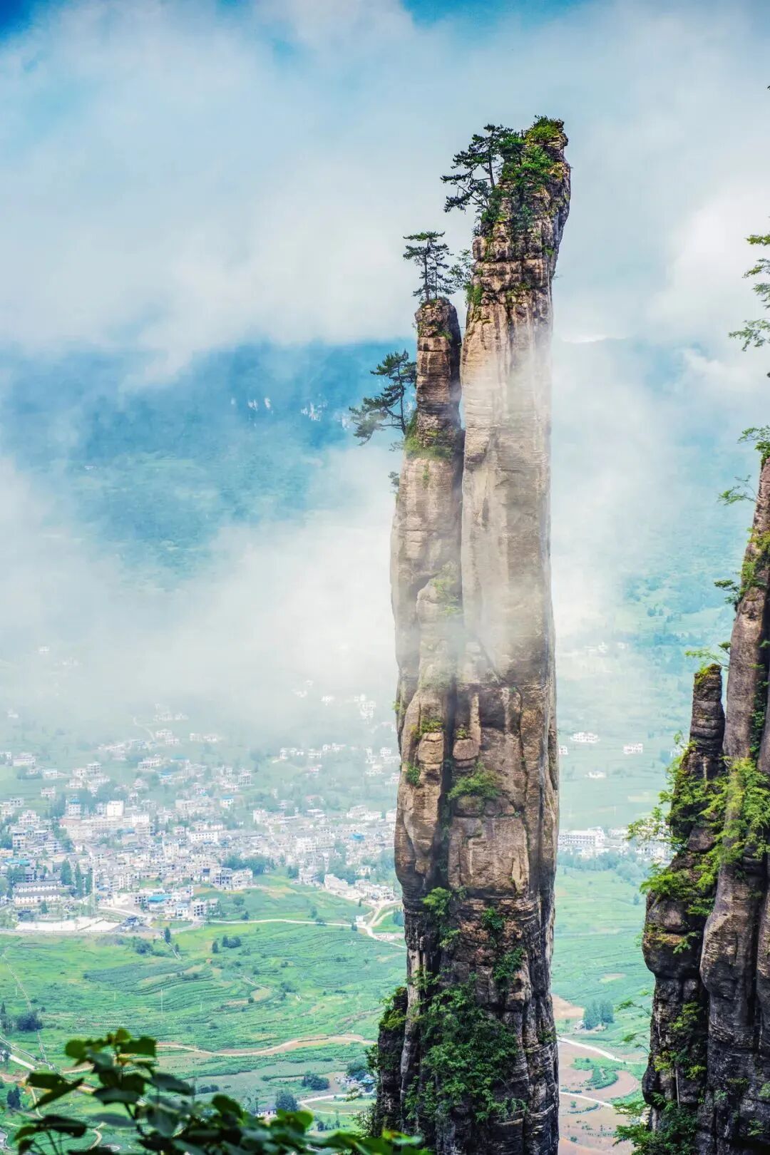 屏山溪流环绕,四周峭壁悬空倚天,峰峦与河谷底部高差1000米以上,形成罕见的峡谷和地缝风光,犹如航行于碧波万顷、苍翠群山间的孤岛。