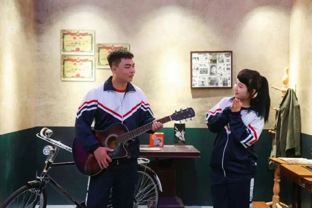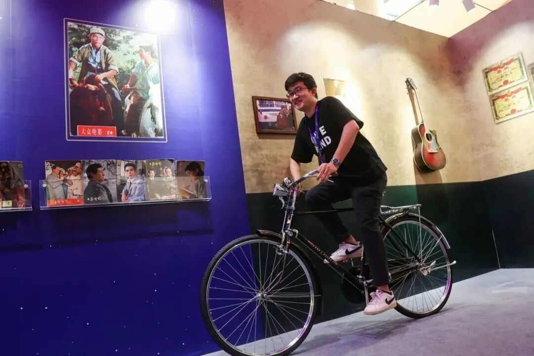 在互动打卡区,大家纷纷与放映机、缝纫机、二八自行车等相关老物件合影,感受电影的独特魅力。
