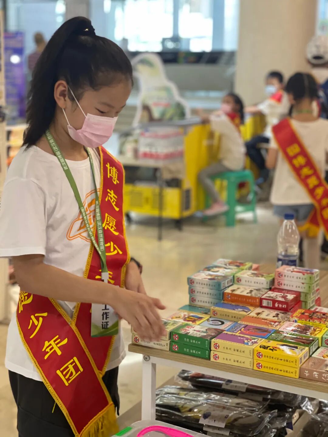 首先我们采访的是文创小小店长,他们在店里站的笔直笔直,一有顾客来,他们就立刻上前介绍商品,他们的主要工作是推荐并介绍商品,摆放商品,将其归位。不少小店长表示十分有趣,是一次难忘的志愿活动。