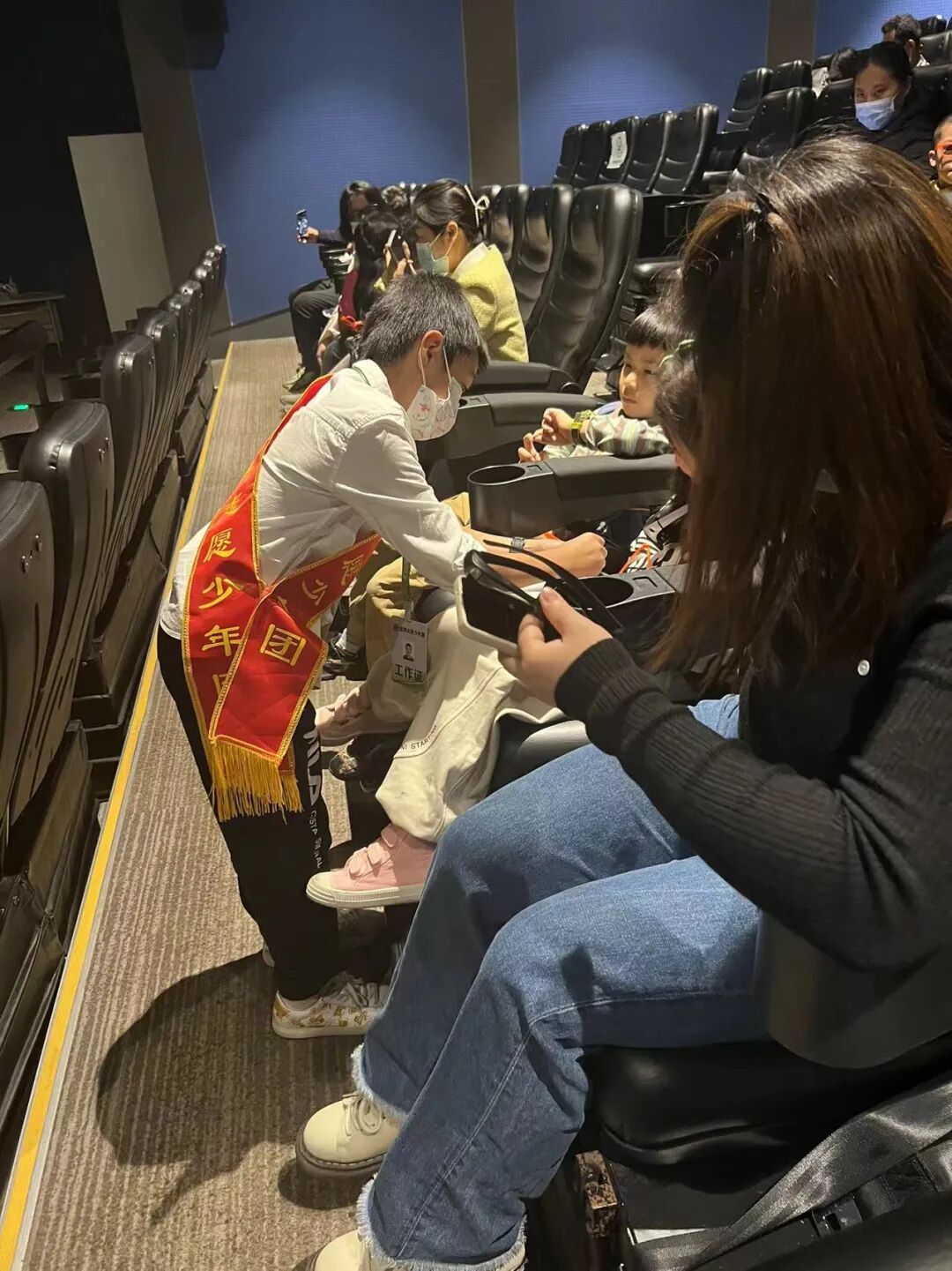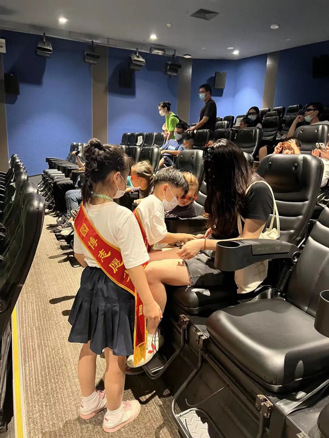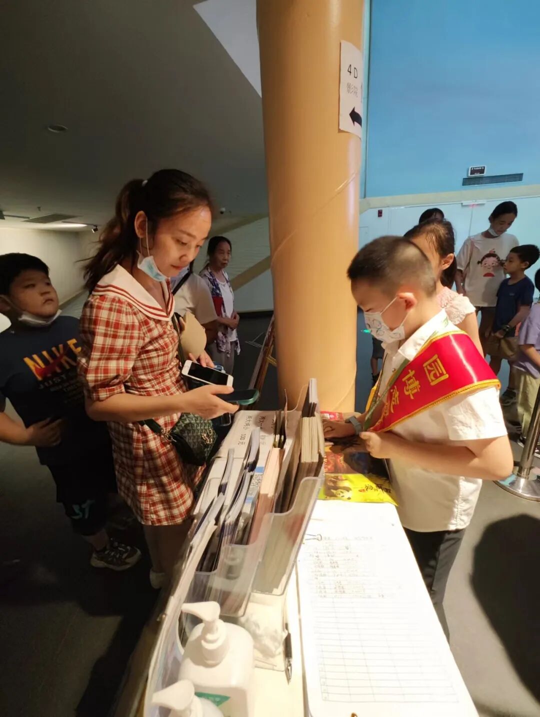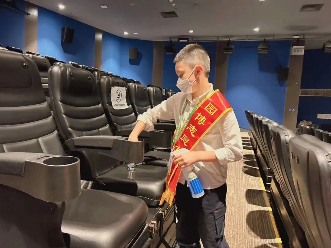 最后我们采访了小小放映员,他们会在4D剧院门口为游客简短的讲解电影内容和电影场次,这个岗位要求很高,不仅要记住每部电影的名字和剧情,以及观影时间,还要流利的介绍给游客们。一位小小放映员说:“这次社会实践很意义,很有趣,但也是一个挑战。”