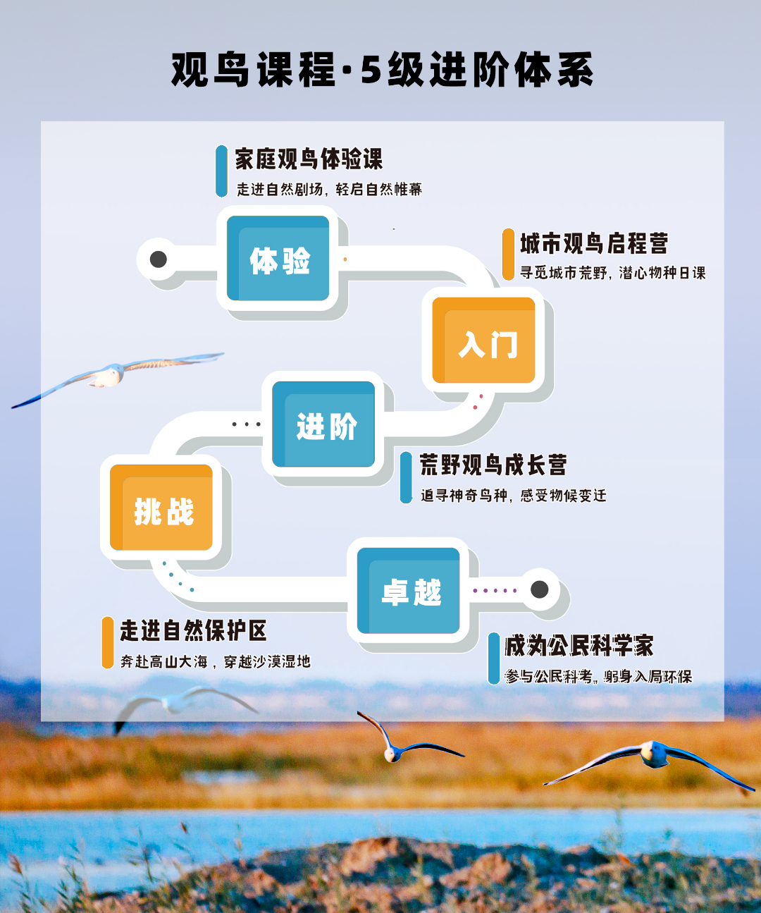 中科院植物园观鸟课,拥有循序渐进的5级进阶课程体系。从家庭观鸟体验课,到城市观鸟启程营、荒野观鸟成长营、再到走进自然保护区、最后到助力成为公民科学家。课堂项目多元有趣,通过鸟类游戏、鸟类观察、鸟类调查、鸟类艺术创作等,给亲子最好的户外自然体验,也给孩子们更专业的学习保障。