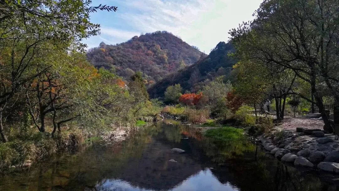 溪谷里的此时红绿黄交织,蓝天白云下显得更加美妙。