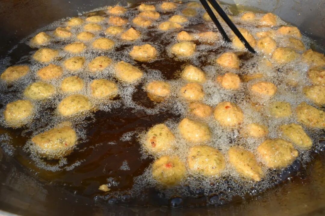 将精选绿豆用石磨磨开,然后浸泡至松软,用石磨磨成豆泥,根据个人口感,加入适量食盐、萝卜丁、葱花,搅拌均匀,炸至金黄色即捞起。趁热吃时,皮酥瓤软,十分可口,还可以热汤泡食,另有风味。