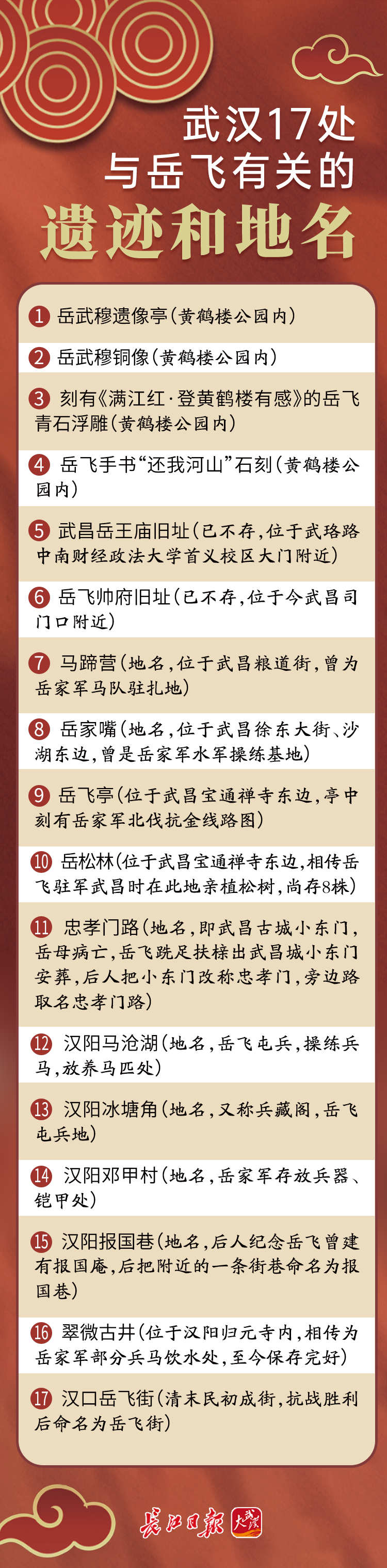 密小华1月29日接受长江日报记者采访时介绍:岳飞短暂的39年人生中,建立丰功伟绩的7年(1134年—1141年)屯兵武昌、汉阳,武昌是岳家军驻扎大本营和北伐基地。武汉三镇遍布岳飞在此期间活动的遗迹,目前已发现17处遗迹和地名,不排除未来还会在武汉发现和岳飞有关的遗迹。