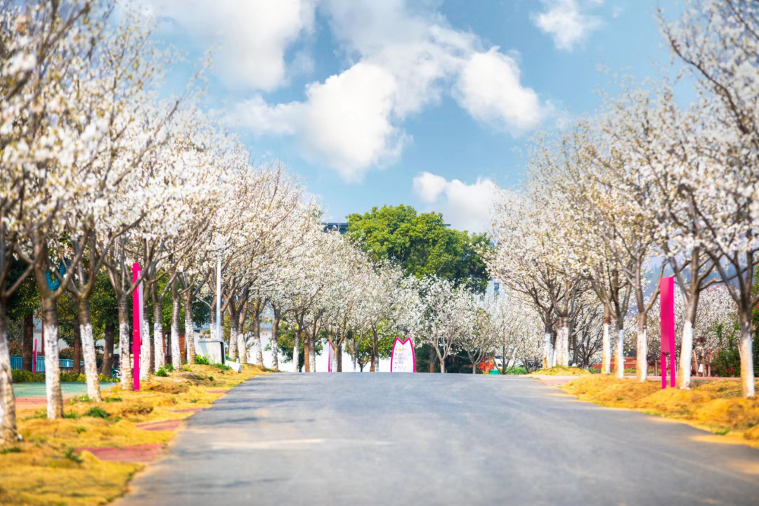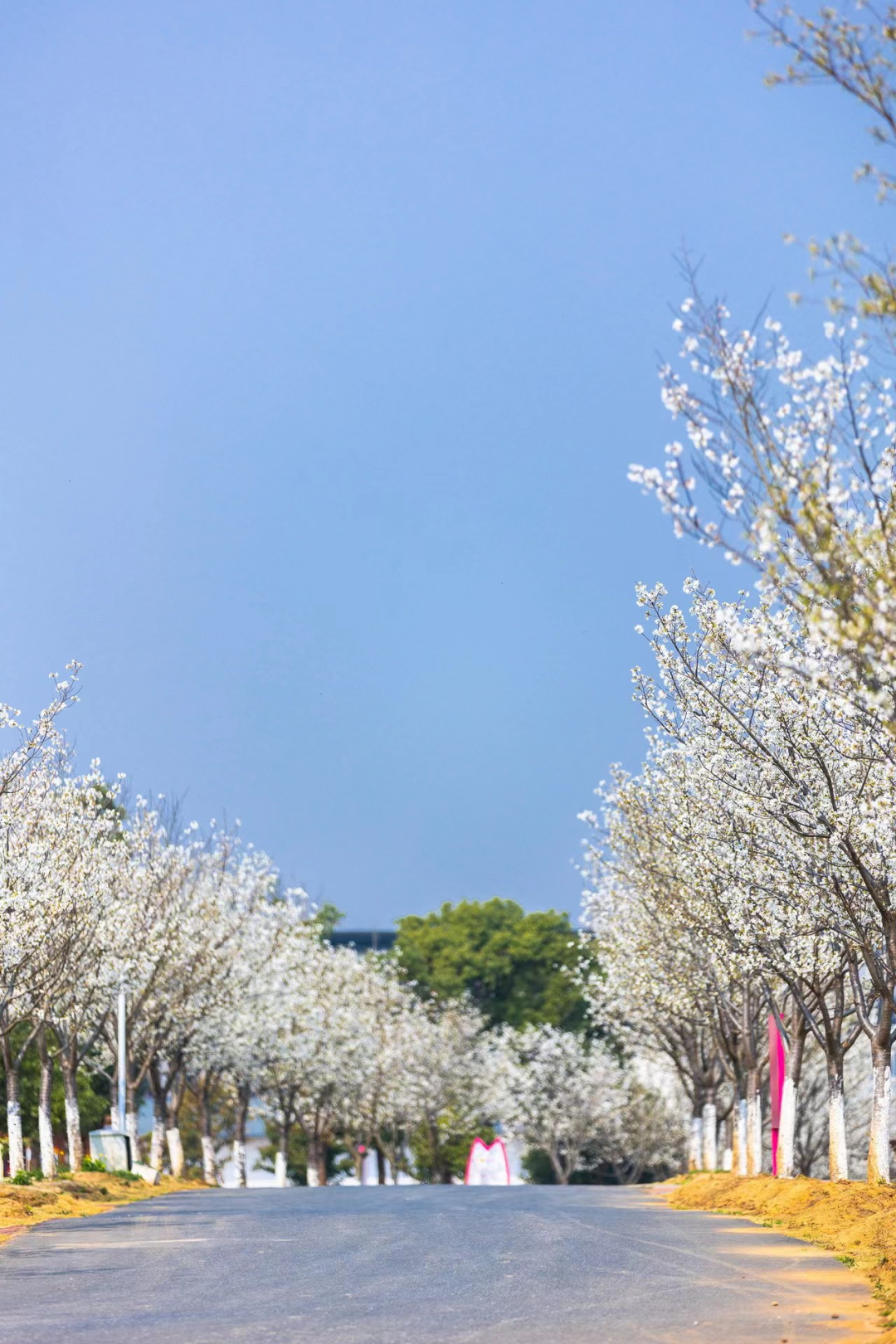 到处都是樱花铺就的大道,映衬着一碧如洗的天空,行走其间,像是进入画里。在金卉庄园徽派建筑的映衬下,韵味十足。