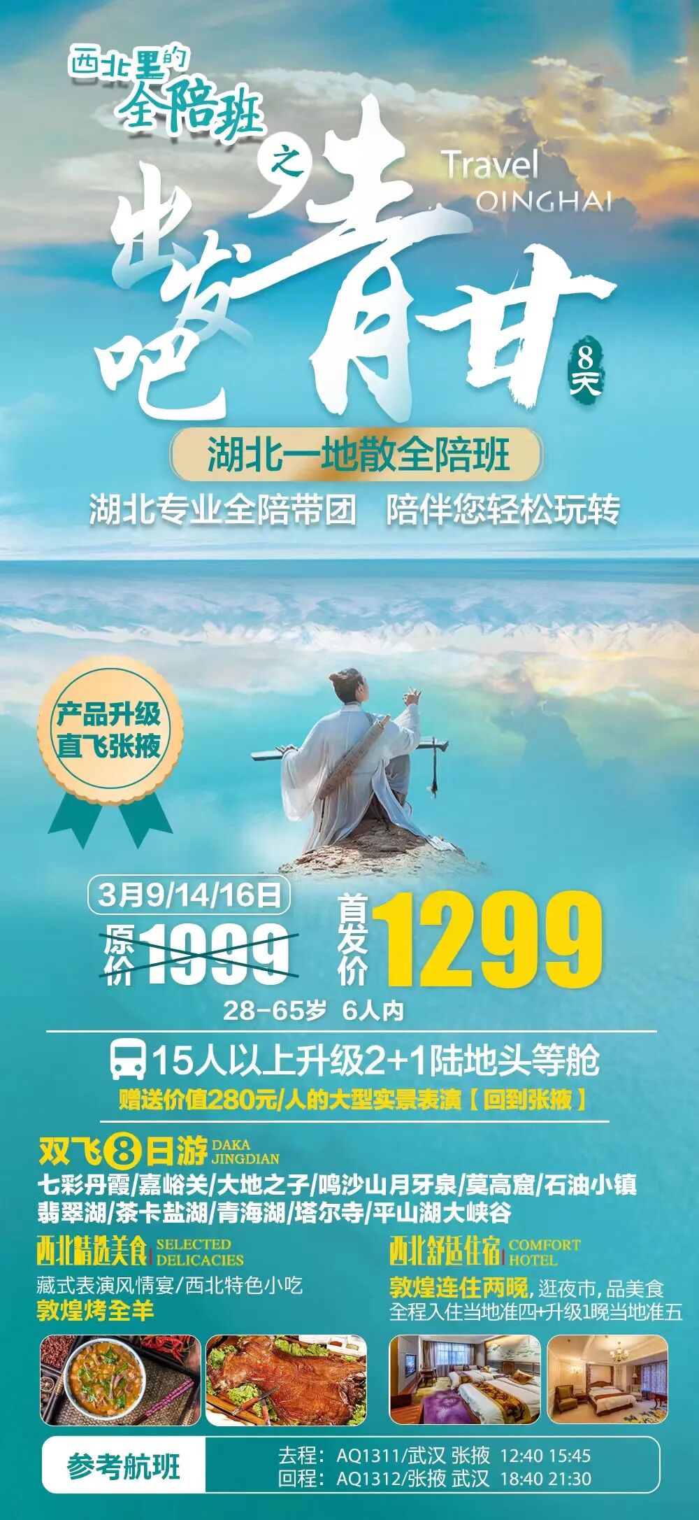 武汉-张掖机票经济舱含税。当地旅游用车保证一人一正座,自由活动期间不提供用车。