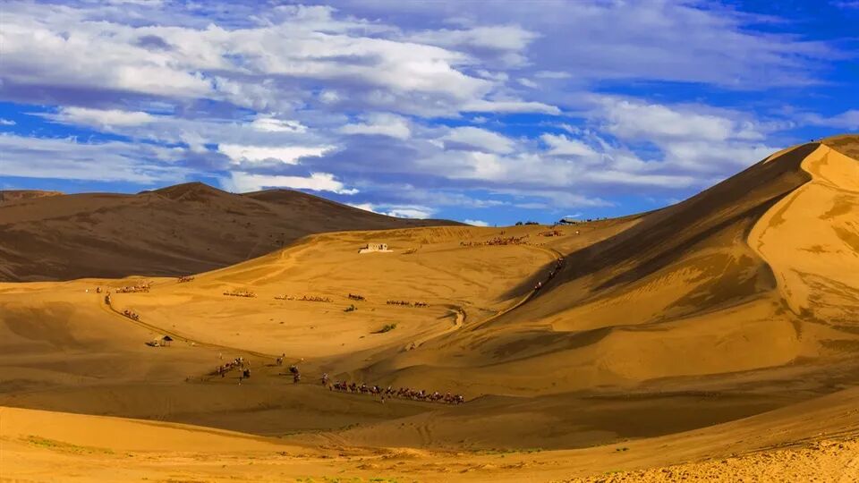 游客可以在鸣沙山体验滑沙、射箭,骑骆驼等项目,山体绵软,无需担心磕碰。月牙泉则有铁背鱼、七星草,五色沙三宝,与鸣沙山相映成趣。