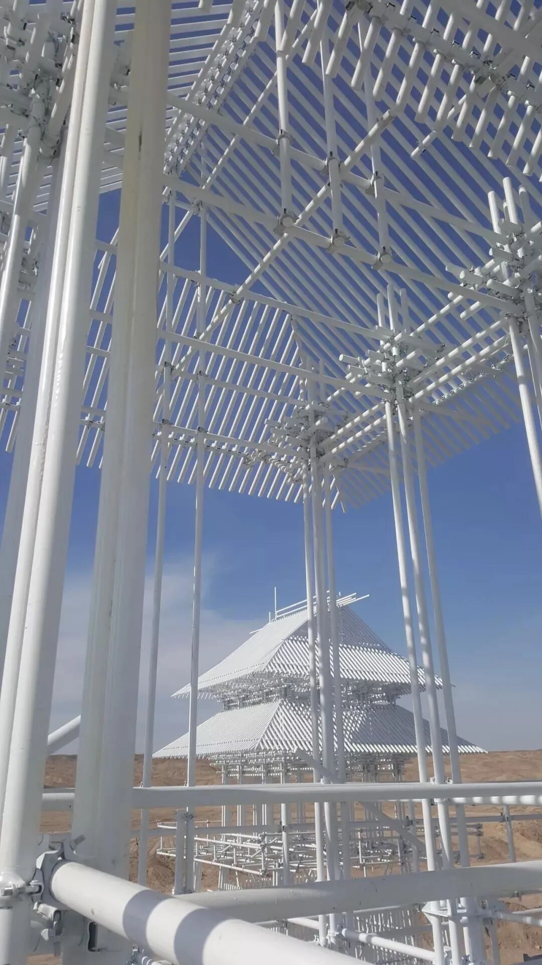 大地之子雕塑南侧有一座由一个“主殿”和四个“阙楼”构成的海市蜃楼。整体造型呈中心对称式殿宇结构,气势磅礴,深邃悠远。