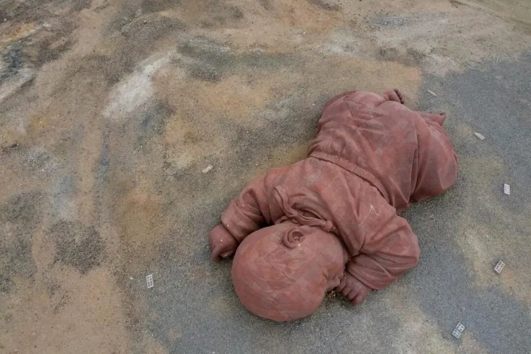 苍茫的大地上俯卧着一个神情安详的婴儿,他仿佛正在大地妈妈的怀抱里安然入睡。这万古深情这戈壁苍穹辉映着古往今来的真诚,表达了对生命的尊重。