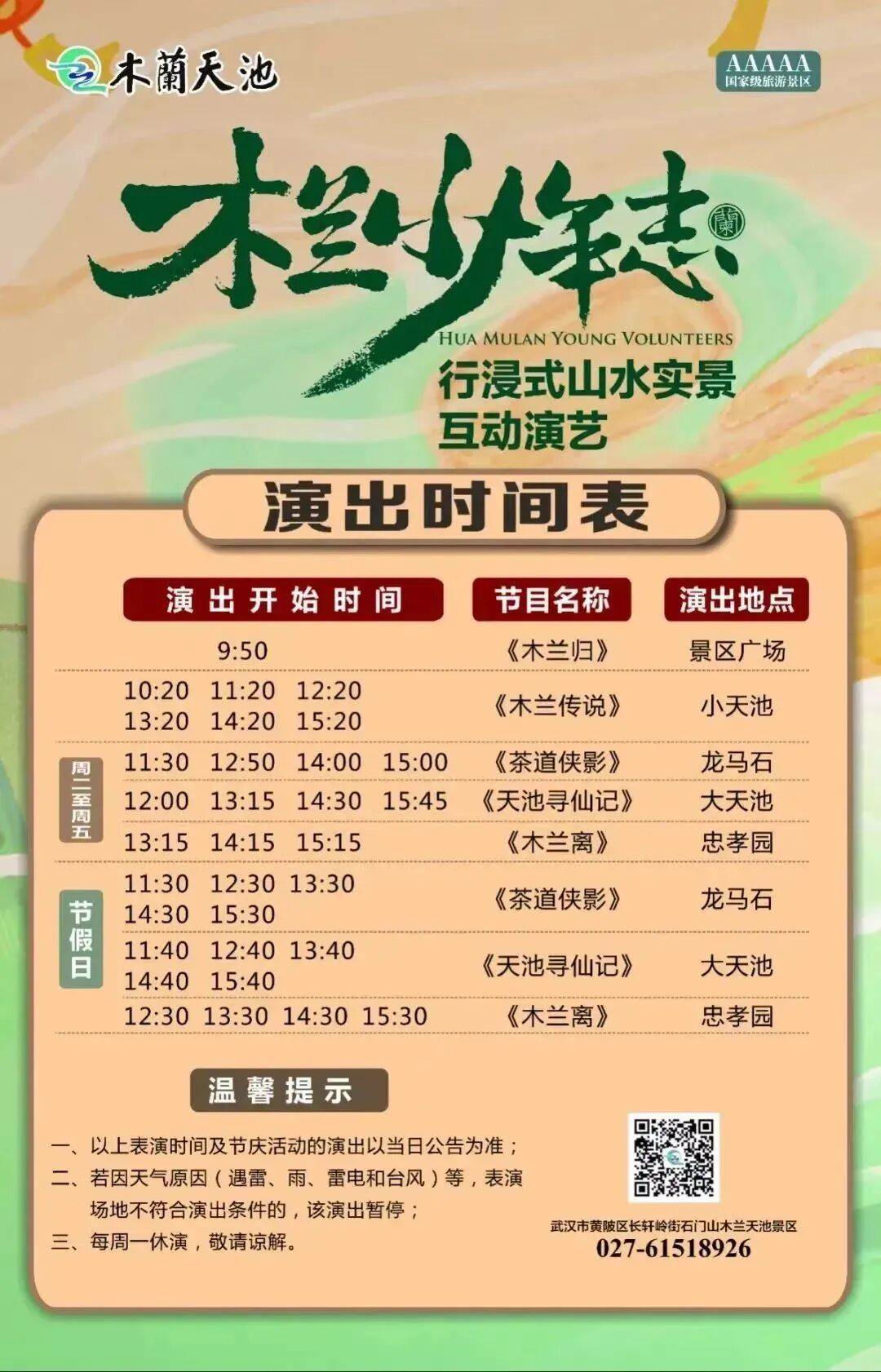 全国首个多点行浸式山水互动演艺《木兰少年志》全新升级,将于3月4日盛大开演。来景区游玩的朋友千万别错过!