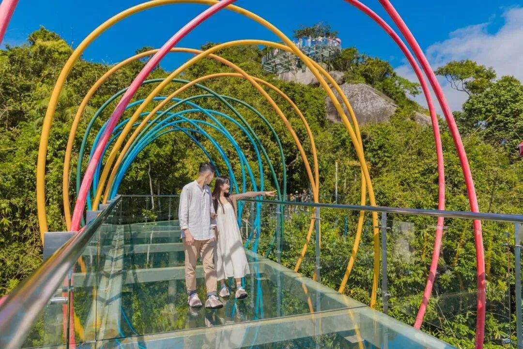 景区拥有全国首座全海景玻璃栈道,全长400米,最高处海拔450米。凌空台、七彩天梯、彩莲观景台、海誓山盟……每个景点都承载着人们对趣味的诉求。