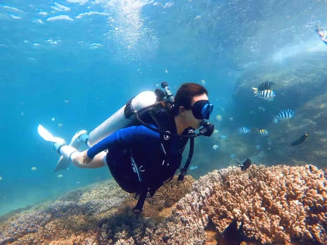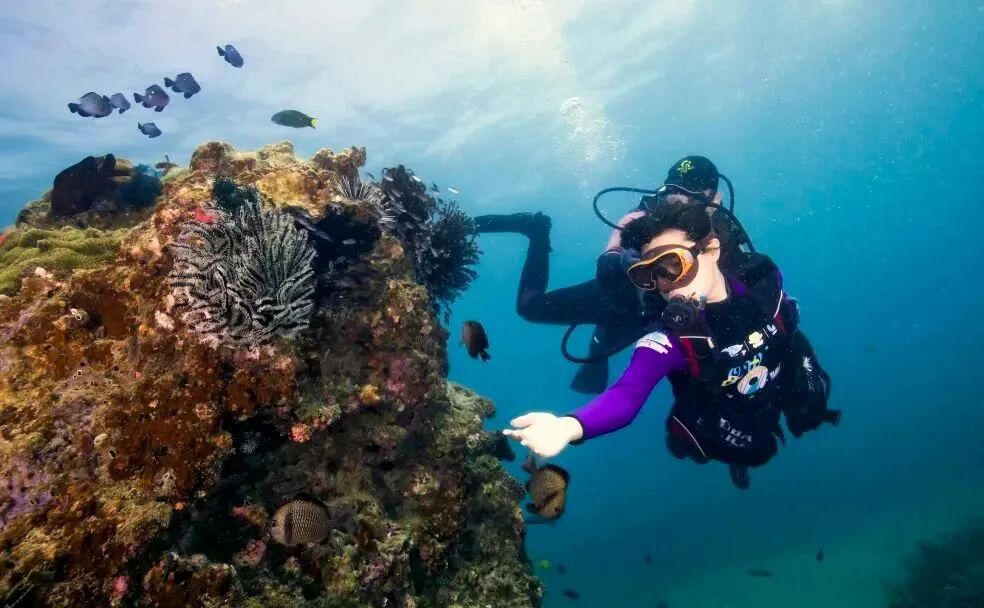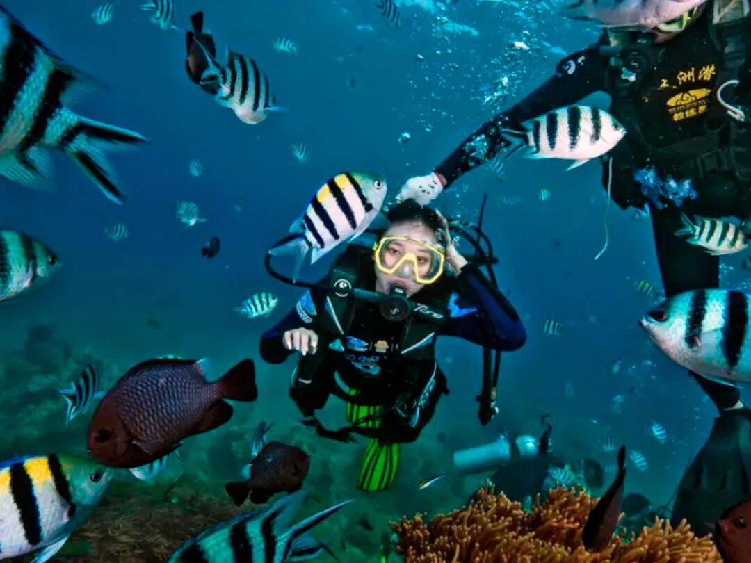 海水可见度深达27米,没有礁石和鹅卵石混杂,是国内知名潜水基地。不仅能和马鲛鱼、海胆、鲳鱼、热带鱼等精灵互动,还能近距离观察色彩斑斓的珊瑚礁。
