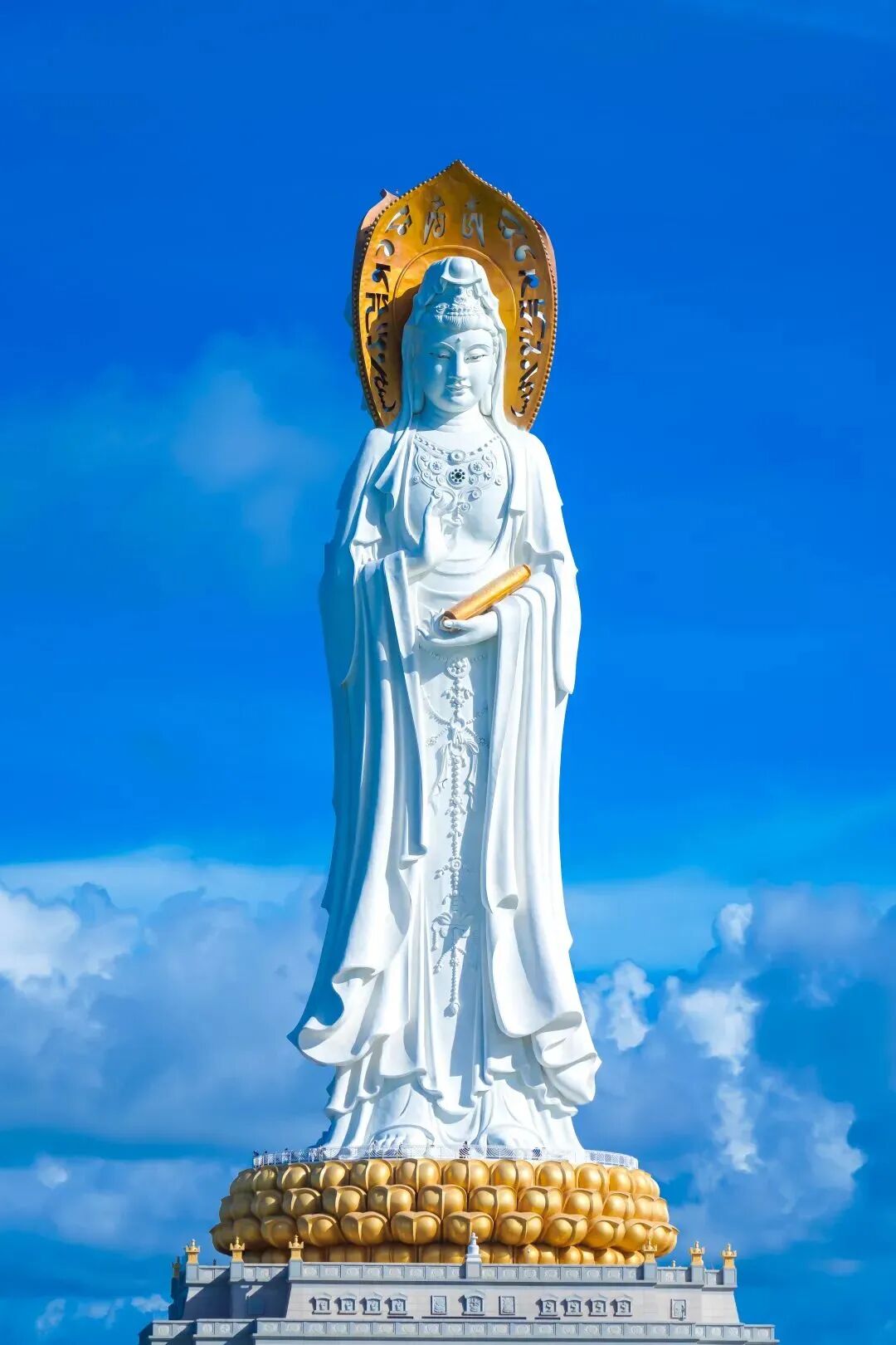 其中108米的海上观音是目前世界首尊金玉观世音菩萨塑像,也是闻名全海南的镇岛之宝。观音圣像被设计为正观音的一体化三尊造型,从每尊的正面看均是一尊观音圣像,环绕一周方可看清三尊手势各异的观音圣像全貌。