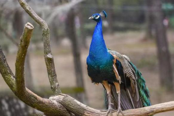 蓝孔雀的冠羽好似一簇直立、发射状的扇形,我们也会学习、模仿蓝孔雀求偶的鸣叫声;