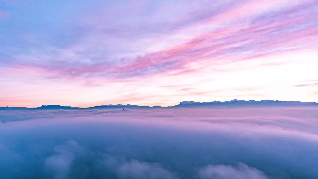 斜阳把整片天空从暖橙红,渲染成烟霞紫