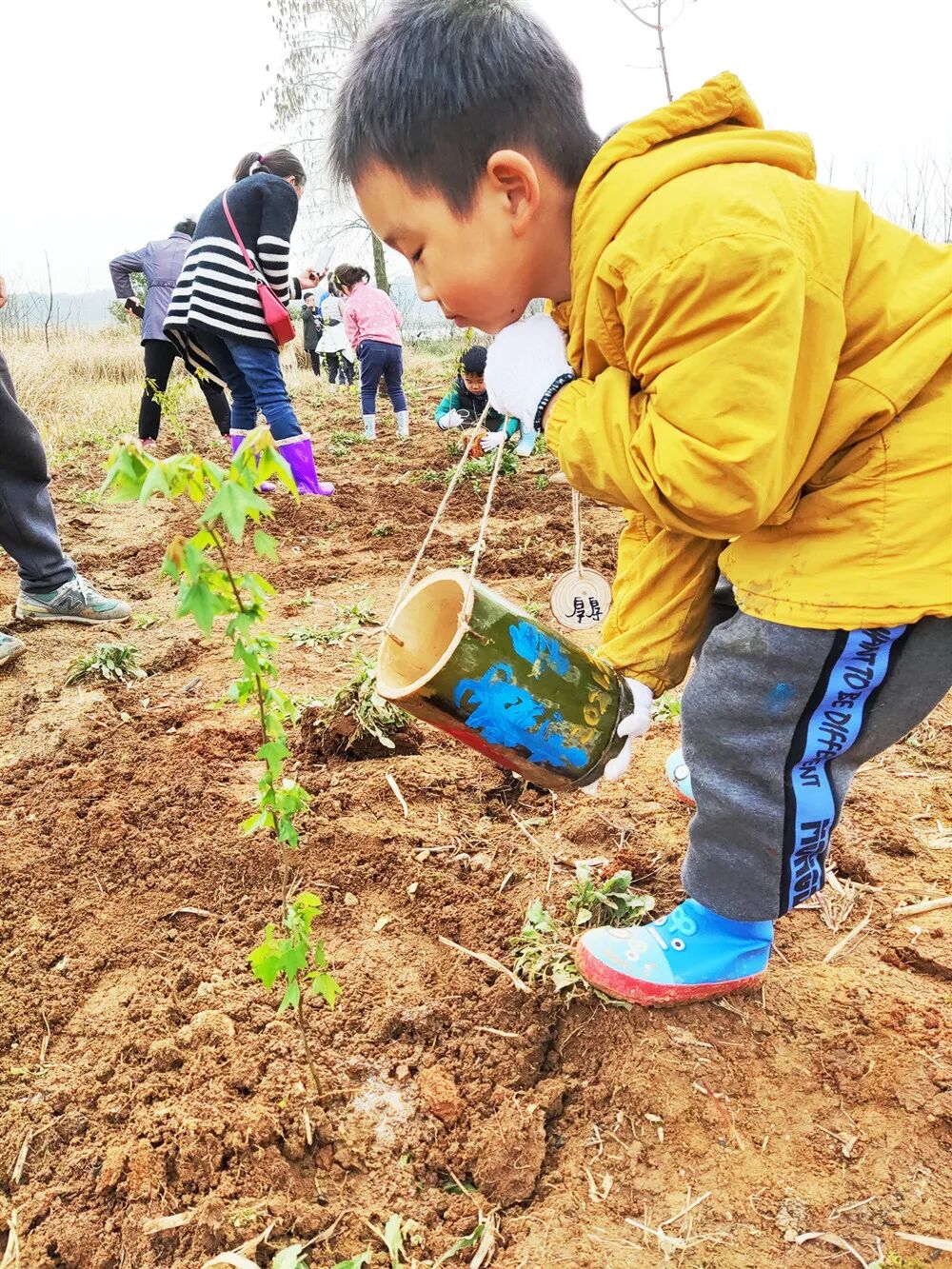 在植树节这样特别的日子里,孩子们和爸爸妈妈一起种下一棵小树,等待春意将它唤醒。