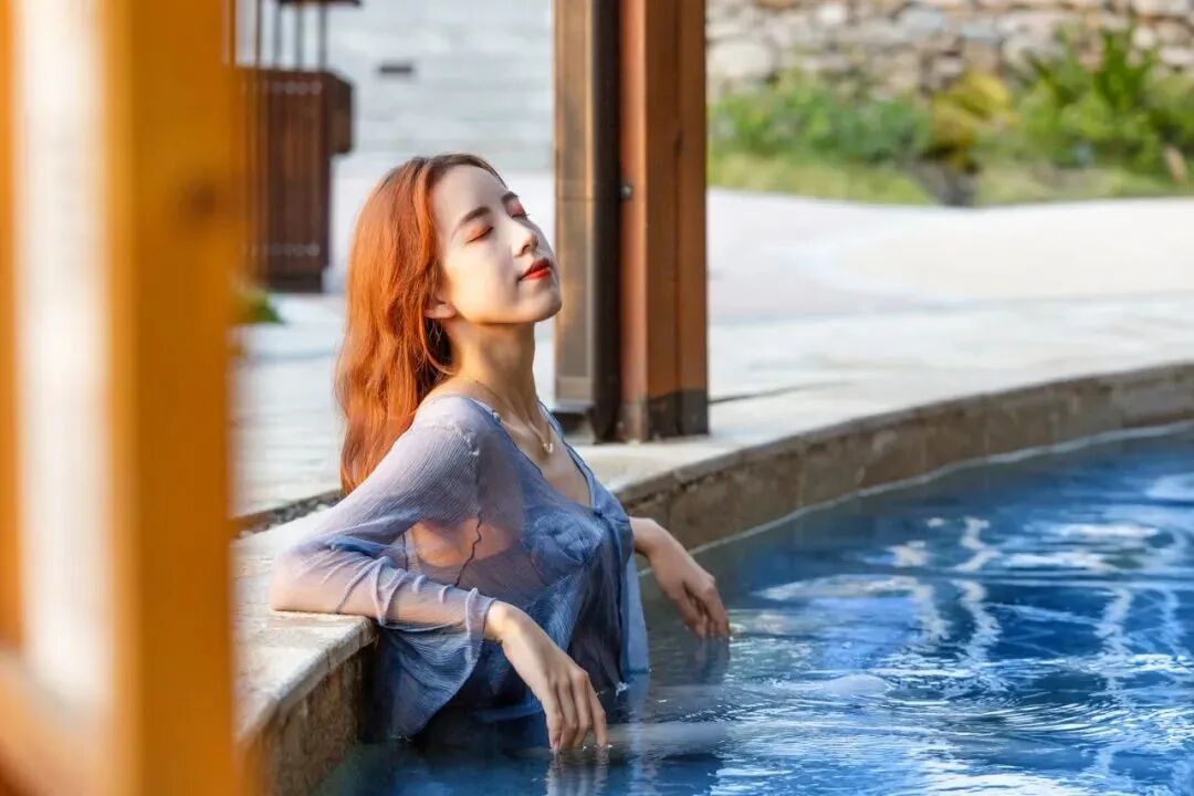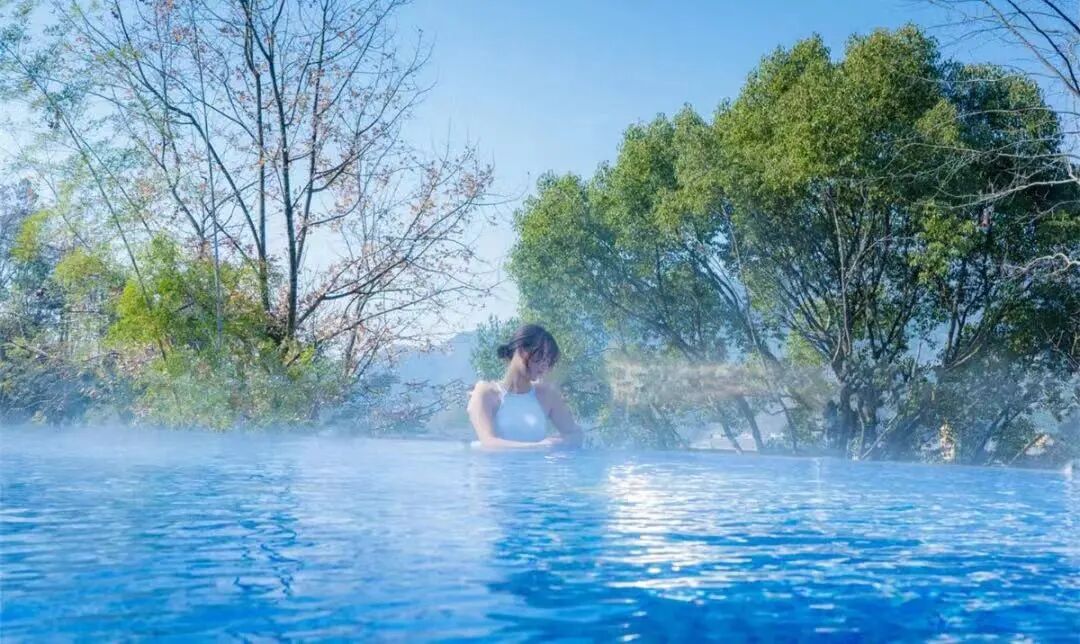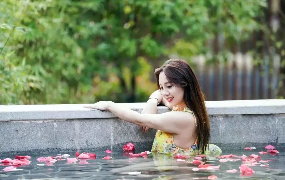 春风微拂,躺在温泉池里