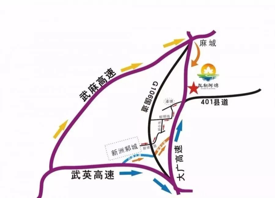 2、武汉三环线(绕城高速、汉口北大道)——武英高速——武麻高速——广高速——铁门收费站下——左转前行一公里——花朝河湾景区1小时