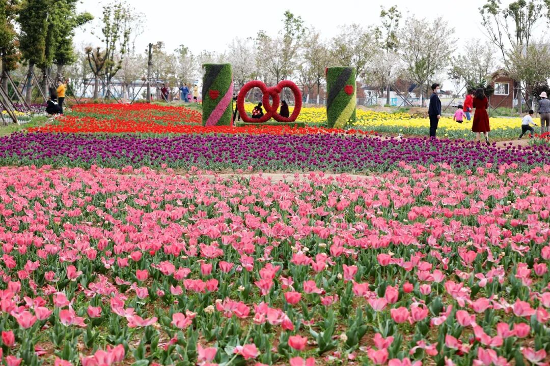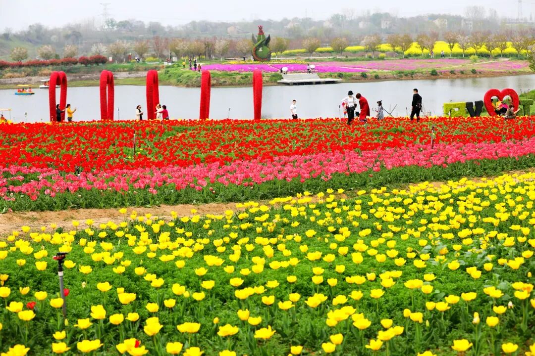 各色的郁金香从景区的大道一路开到了游湖的岸边,