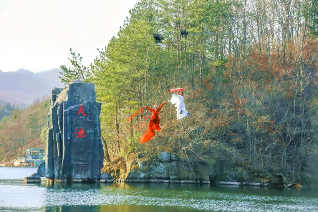 随彩虹索道而上,景秀森峡尽收眼底,泛舟而上,坐享一季天池水。
