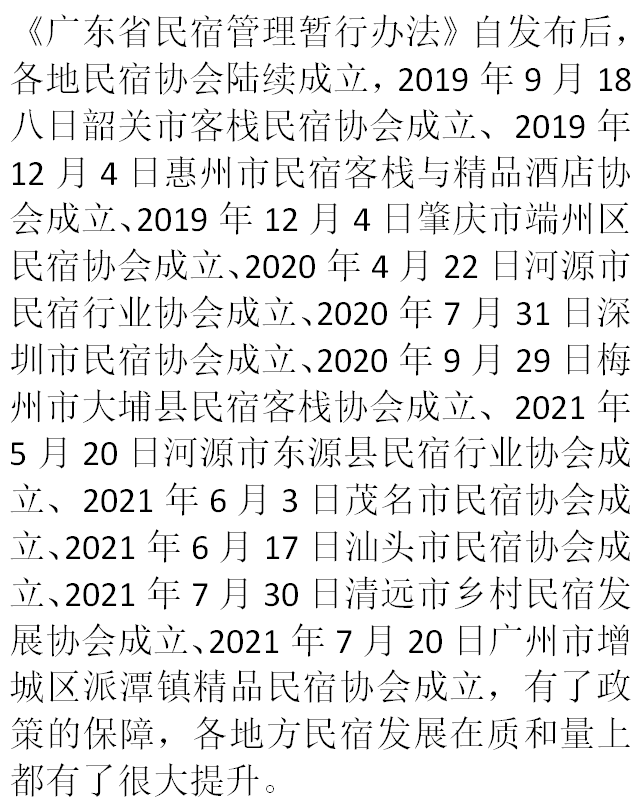 业界认为,各地民宿政策也在鼓励民宿行业协会自律发展,这一年来广州市民宿协会、惠州市民宿客栈与精品酒店协会,韶关市客栈民宿协会,河源市民宿行业协会,深圳市民宿协会先后筹备成立,在全国范围内一年时间如此密集的市级民宿协会组织成立极为罕见,可见政策的推动力量。