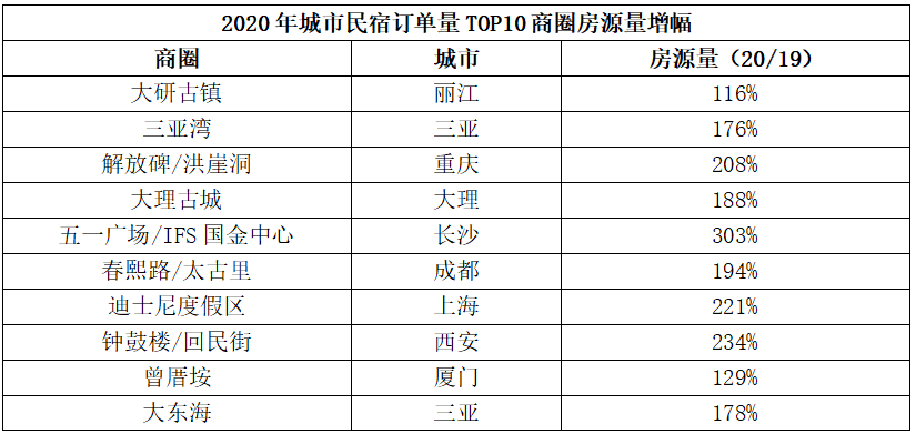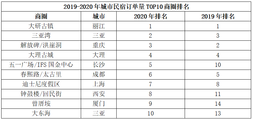 大研古镇、三亚湾、解放碑/洪崖洞、大理古城和迪士尼度假区,这五大商圈2019-2020年,除了个别名次略有变化外,基本保持稳定,巩固了城市民宿商圈“第一梯队”的地位。
