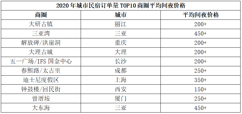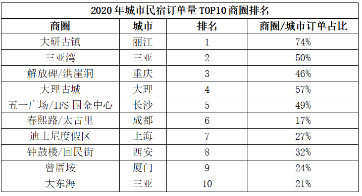 下面是根据途家民宿数据统计显示,2020年国内城市民宿订单量排名最高的十大城市商圈: