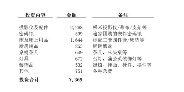 投资:房间上线前的所有投入(除房租外)为7369,具体见下图投资清单。