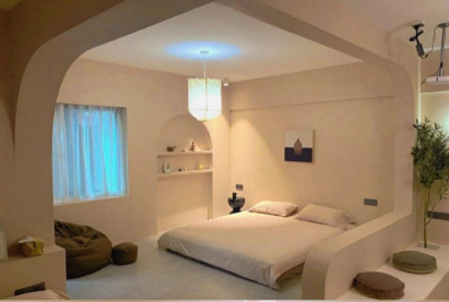 ,高级的侘寂风,极简的洞穴风榻榻米大床,高清巨幕投影