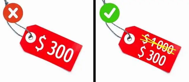 一件商品直接标价「300元」,和「原价1000元,现价300元」的效果肯定是不一样的,这里的「原价」就是锚。