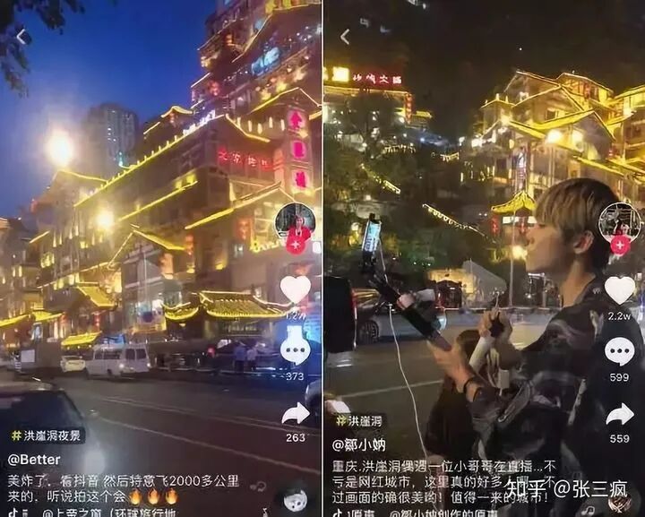 2月28日发布的一条“远道从广东顺德来到重庆看看这种神秘的城市,就为了看看抖音上穿楼而过的轻轨……”视频拿下了重庆抖音最高播放量,到了4月,吊脚楼洪崖洞的夜景开始持续在社交网络上刷屏。