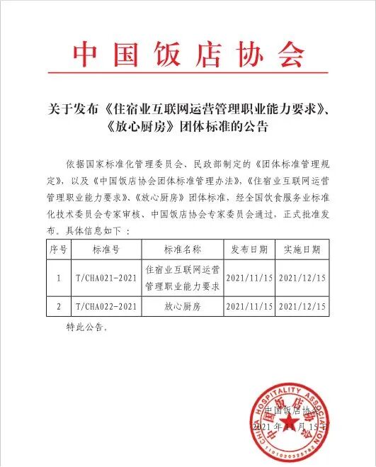 2021年11月15日,中国饭店协会发布国内首份《住宿业互联网运营管理职业能力要求》团体标准