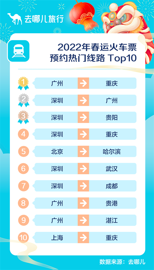 从去哪儿春运火车票预约票量来看,热门线路以从北上广深到西南及中部城市为主。春运火车热门线路TOP10是: