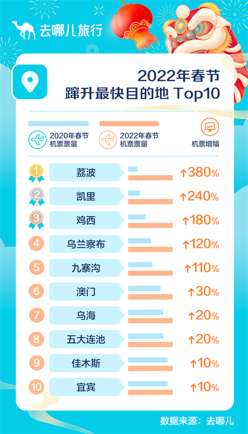 从去哪儿2022年春节同比2020年春节机票票量增幅来看,蹿升最快的均是小众目的地: