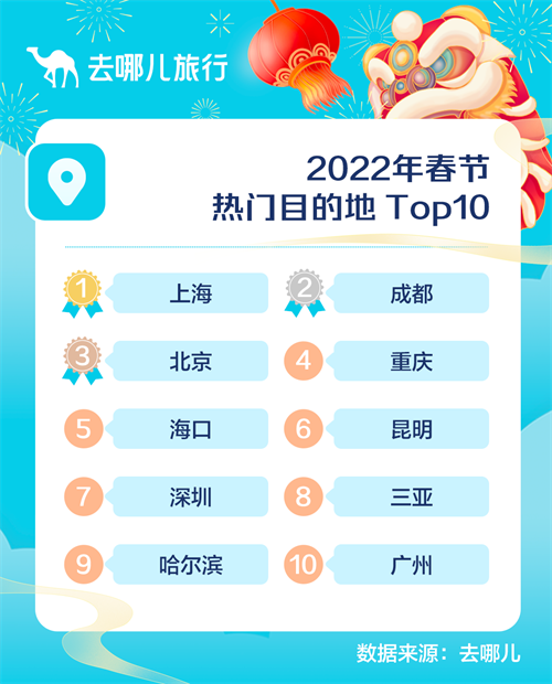 去哪儿数据显示,2022年元旦假期国内酒店预订热门城市Top10依次是北京、上海、重庆、成都、广州、长沙、三亚、深圳、武汉和南京。