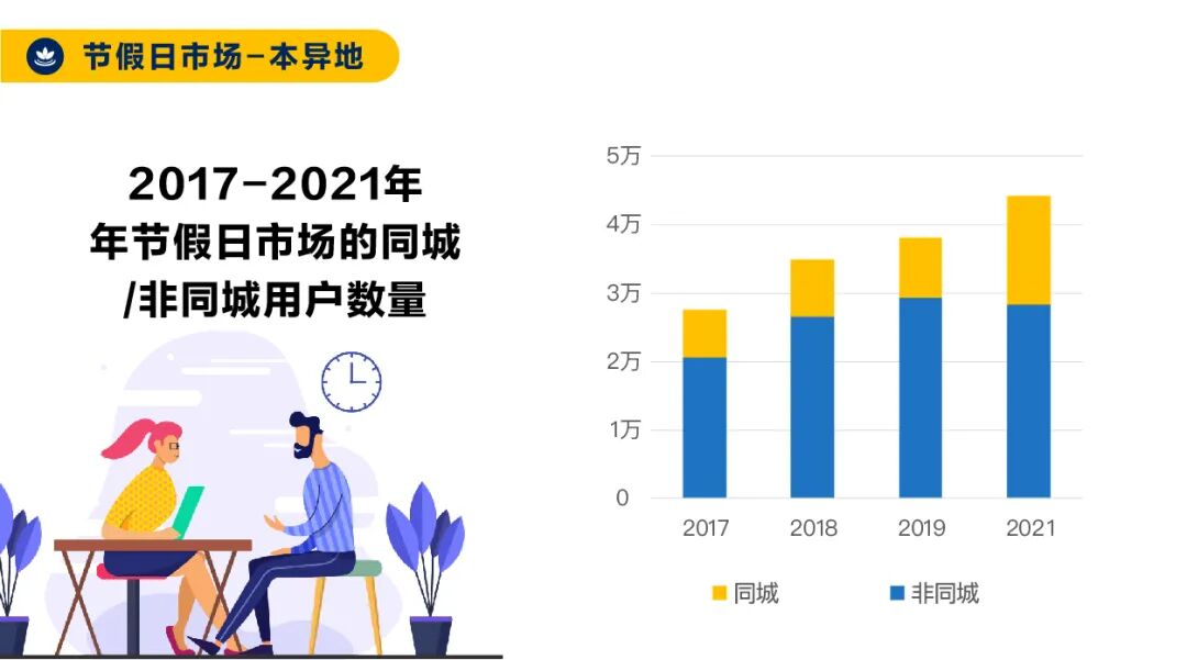 近五年温泉民宿节假日市场的用户逐年增长。目前市场以非同城用户为主,但是在疫情的冲击使得同城用户规模急剧增长。