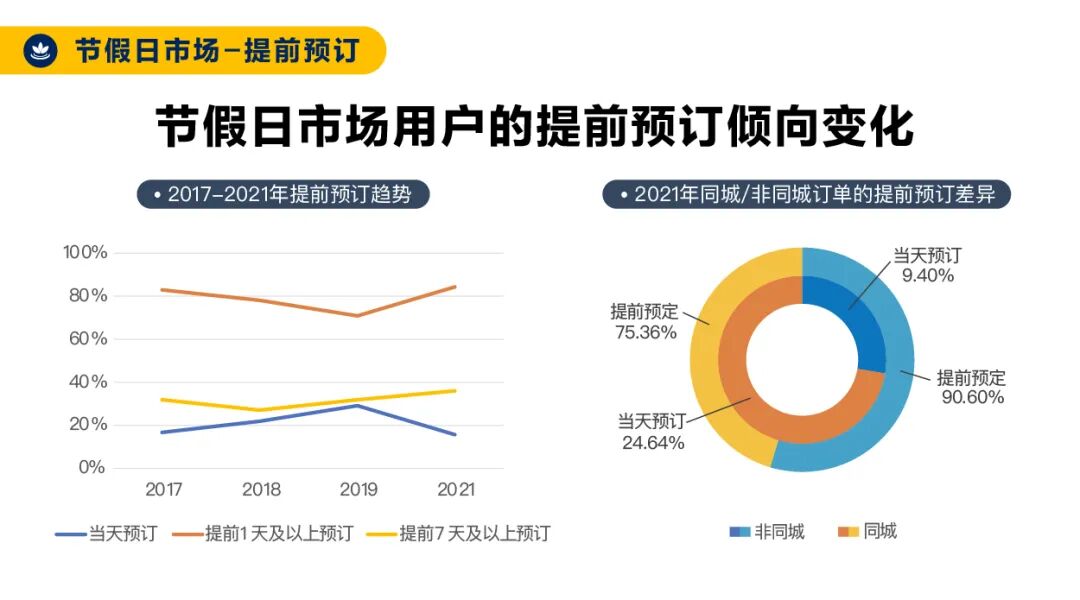 疫情发生后,消费者更加偏向于提前预订,85%的订单为提前1天以上预订,35%的订单提前7天及以上预订。