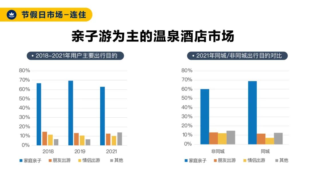 目前来看,温泉民宿用户多以亲子游为主要出行目的,尤其同城订单中亲子携娃出行的比例会更高。