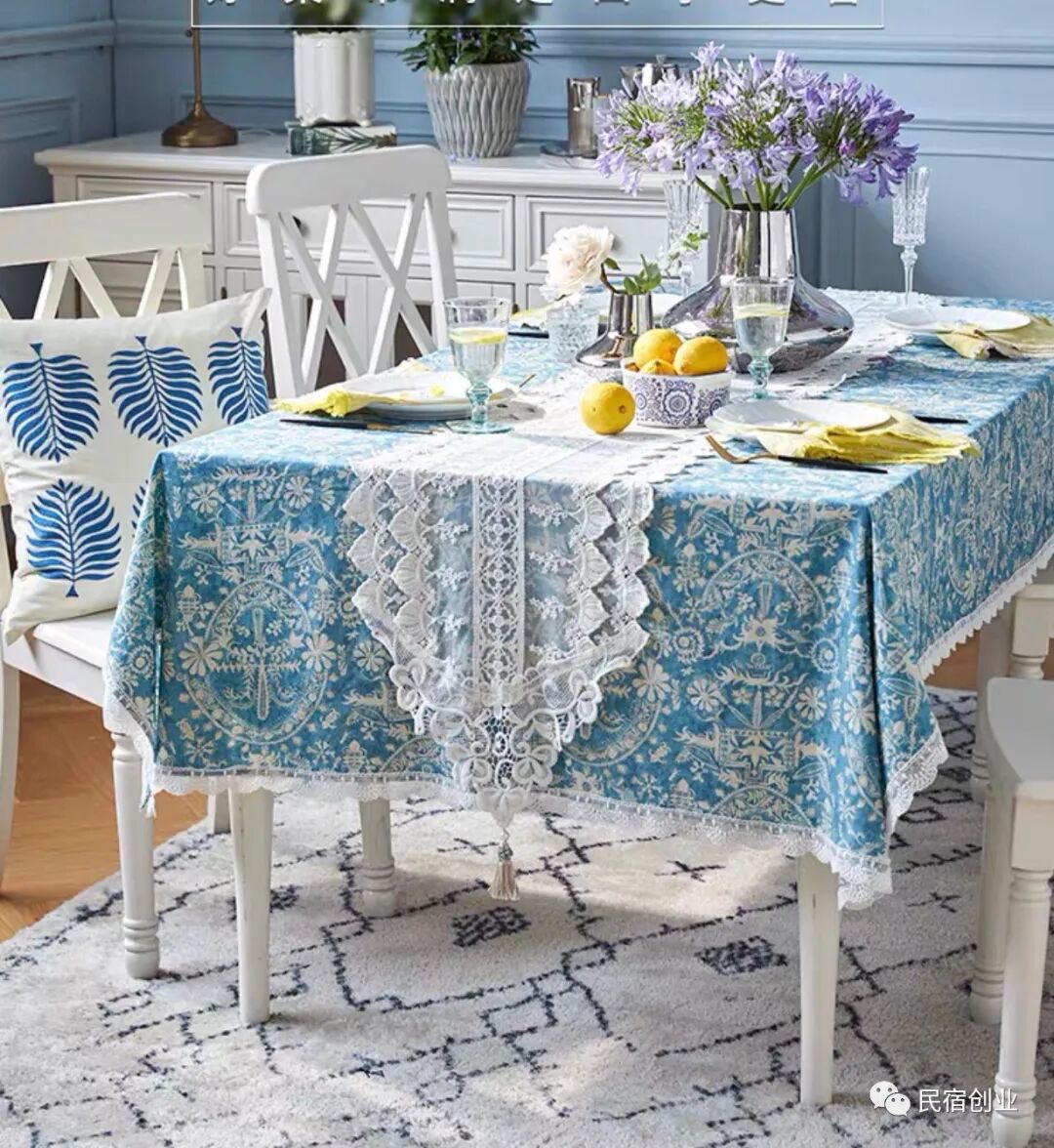 餐桌的桌布是提升整个城市民宿档次和颜值最好的方法,也是奶爸用的最多的。不同主题的桌布覆盖原来的餐桌,即使是餐桌很久很土,也可以焕然一新,突出质感。