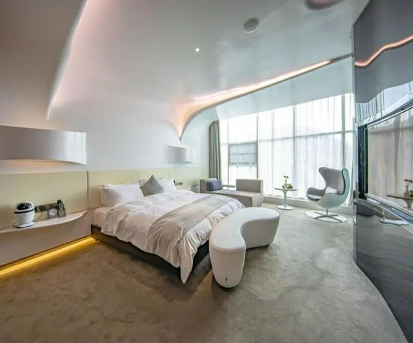 “智能化”是悬崖酒店的定位,无论家具还是卫浴都是高标准设计。酒店客房里处处体现着“科技范”,无论是灯光、空调的控制,还是窗帘窗纱的开关,都可让床头“小白”替你完成。客房里还配备了大尺寸曲面屏电视,触屏式补光灯化妆镜,浴室与卧室间的大尺寸雾化玻璃,让人仿佛置身于太空舱中,未来感十足。