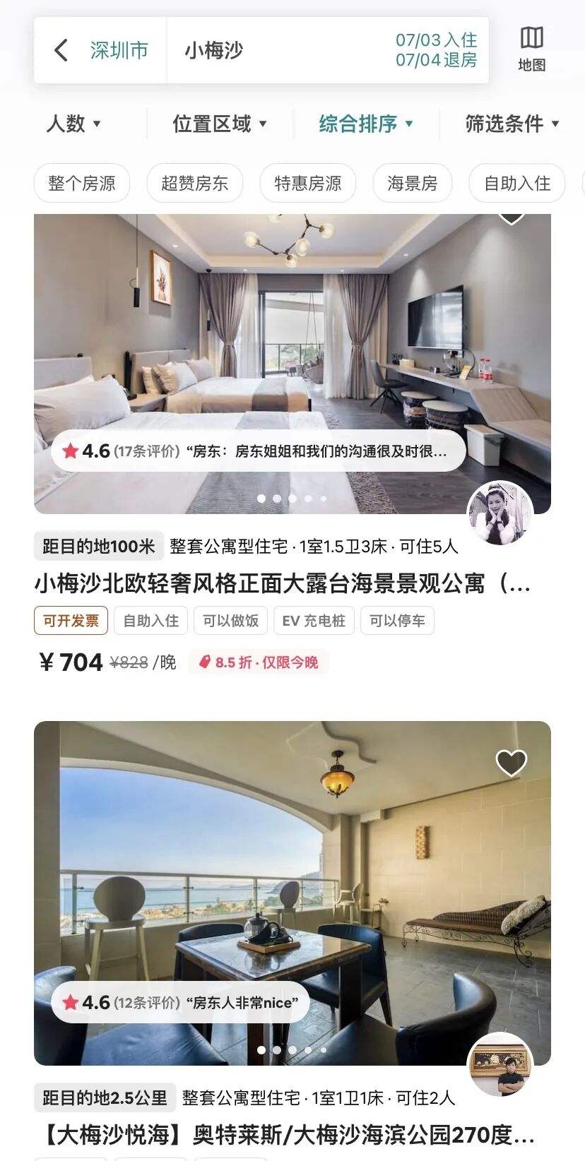 举个例子,奶爸今天要带两个宝宝去小梅沙玩,我打开了各大民宿APP,我也不着急立马从中做出一个选择,因为我要比对图片与详情以及价格的性价比。