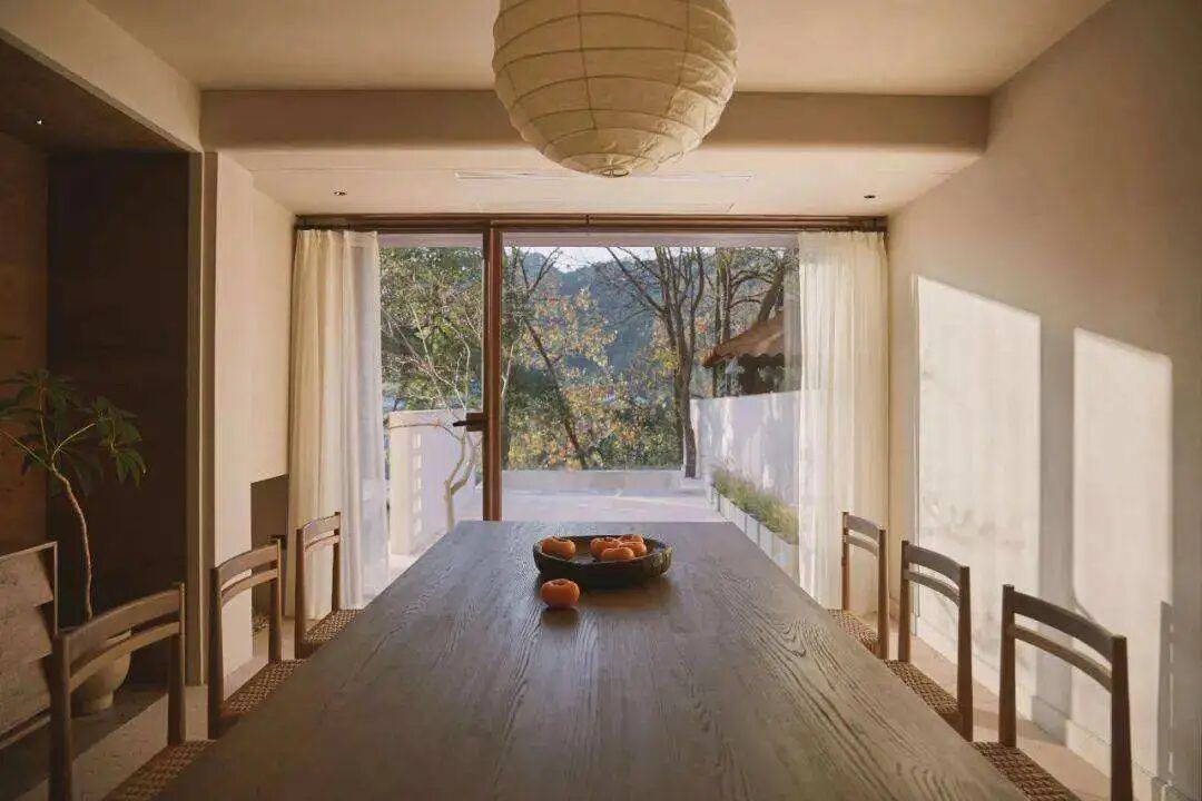 房间名字都和特定的景有关。有的房间正对着窗外清新茶山,所以取名为青山;有的正对着白色屋顶,便取名为寻白…真正做到以窗为框,一房一景各有不同。
