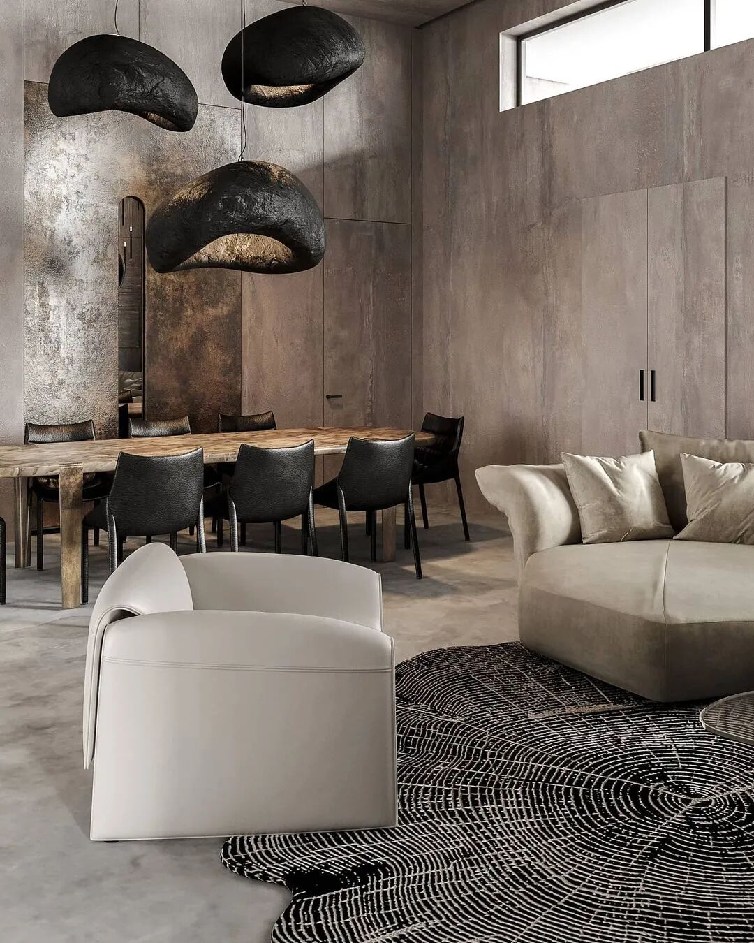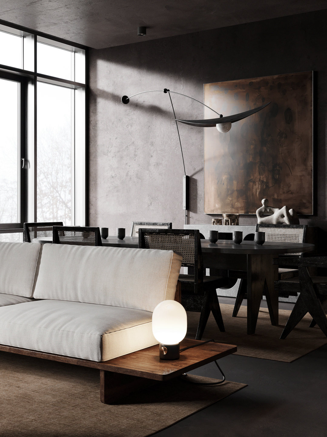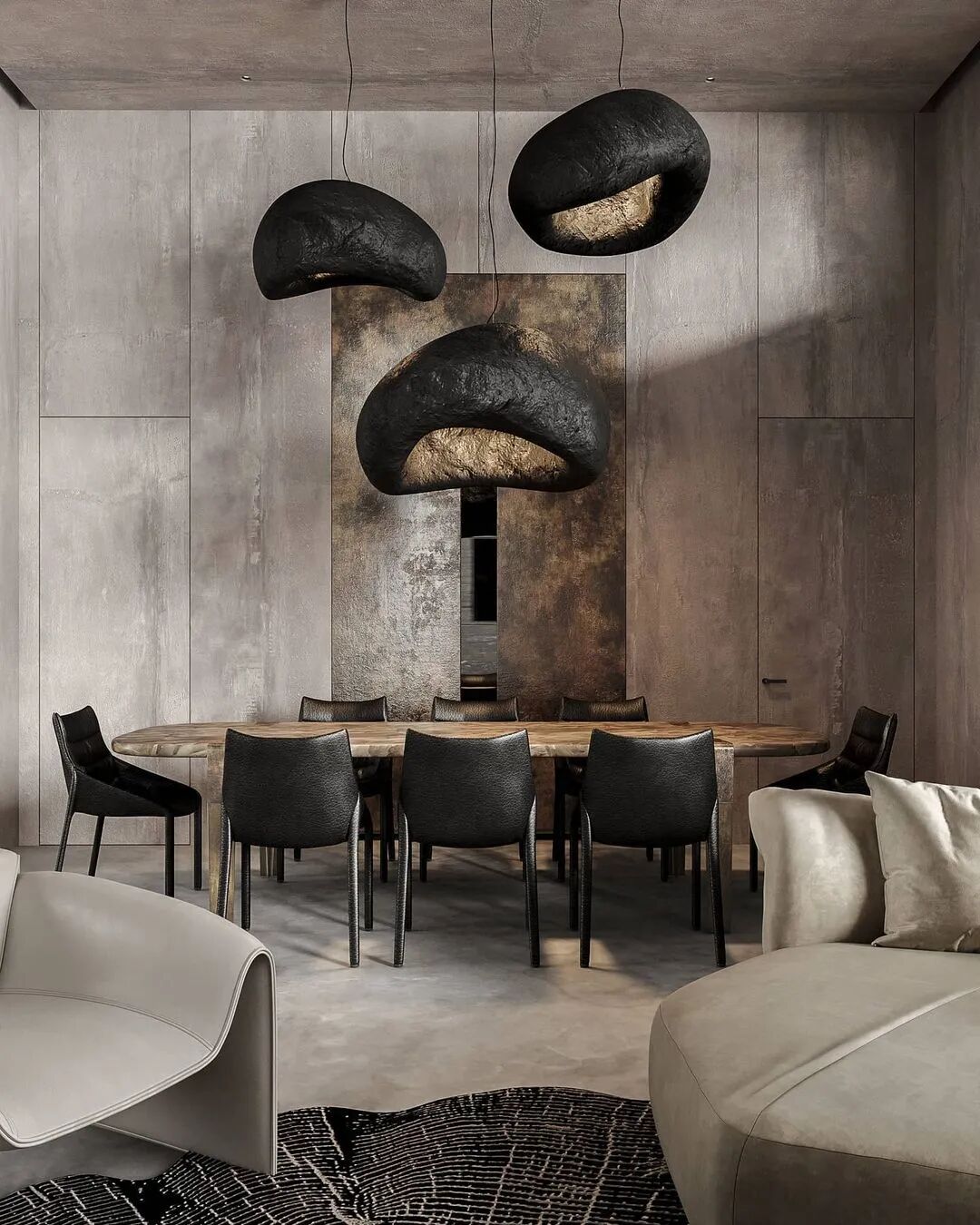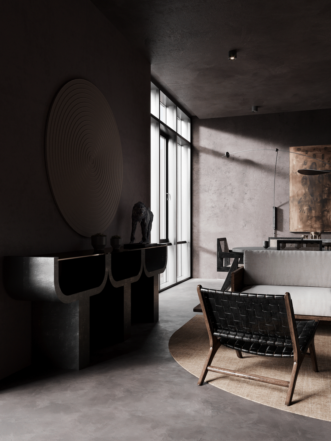 想将kelly wearstler控制台流畅圆润的线条与工作室椅子的粗犷直线相结合,赋予静态形式一种动态的感觉。用giancarlo valle工作室的浮灯,光滑的形状强调了这一切。