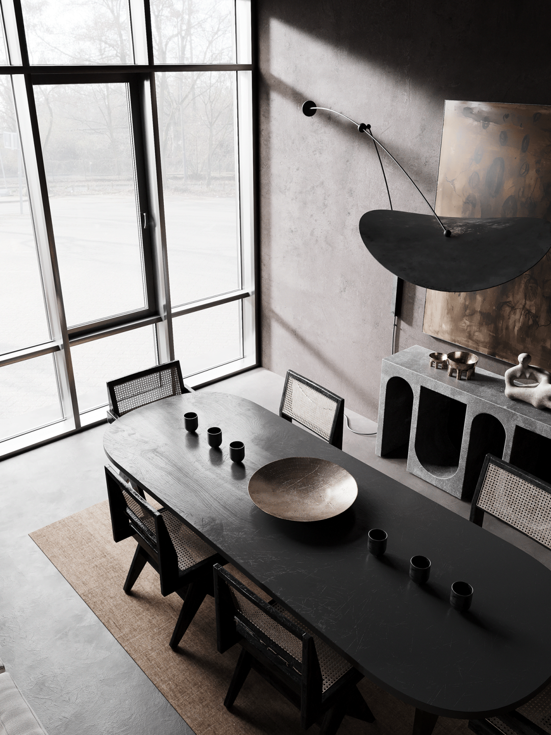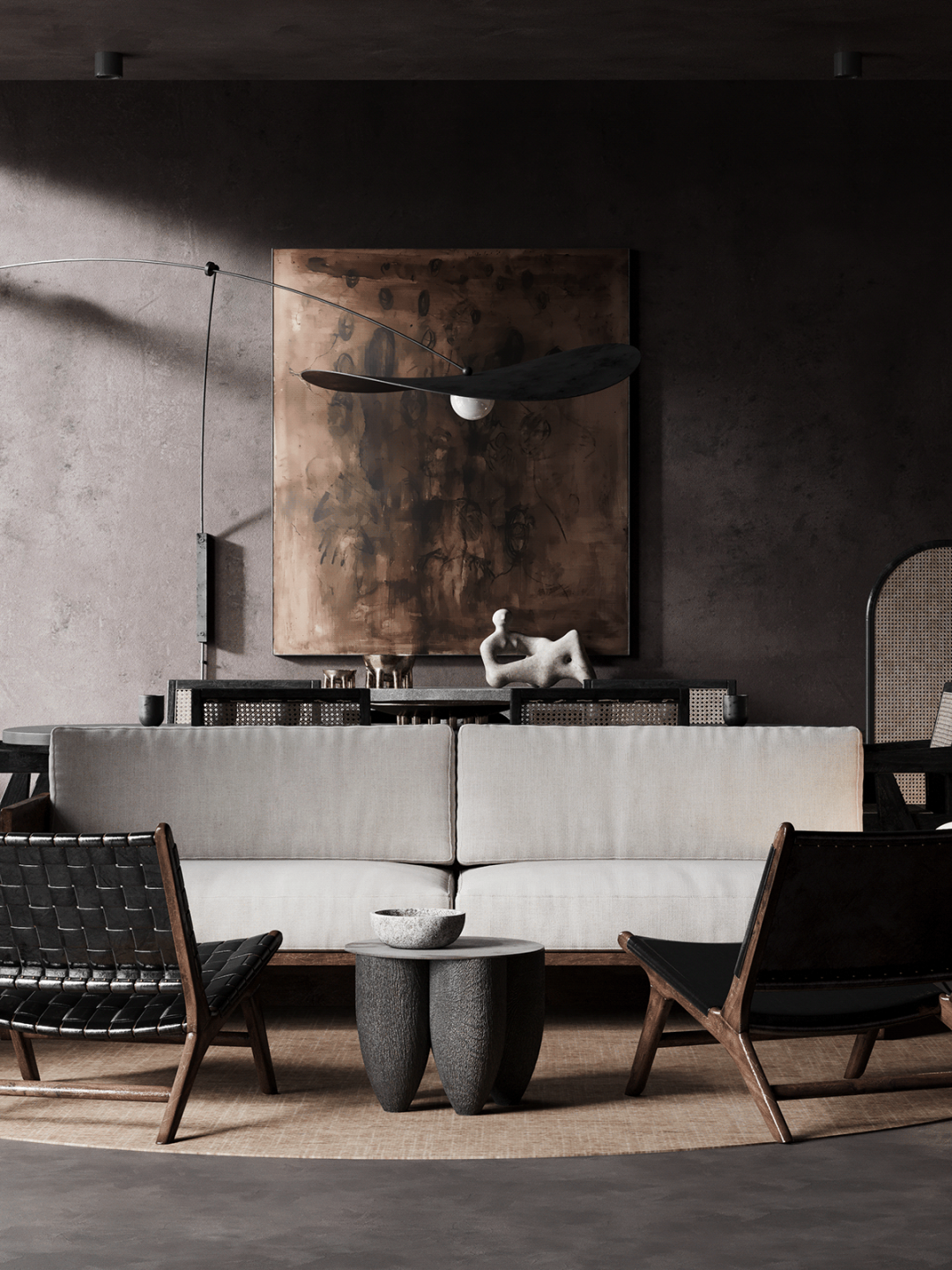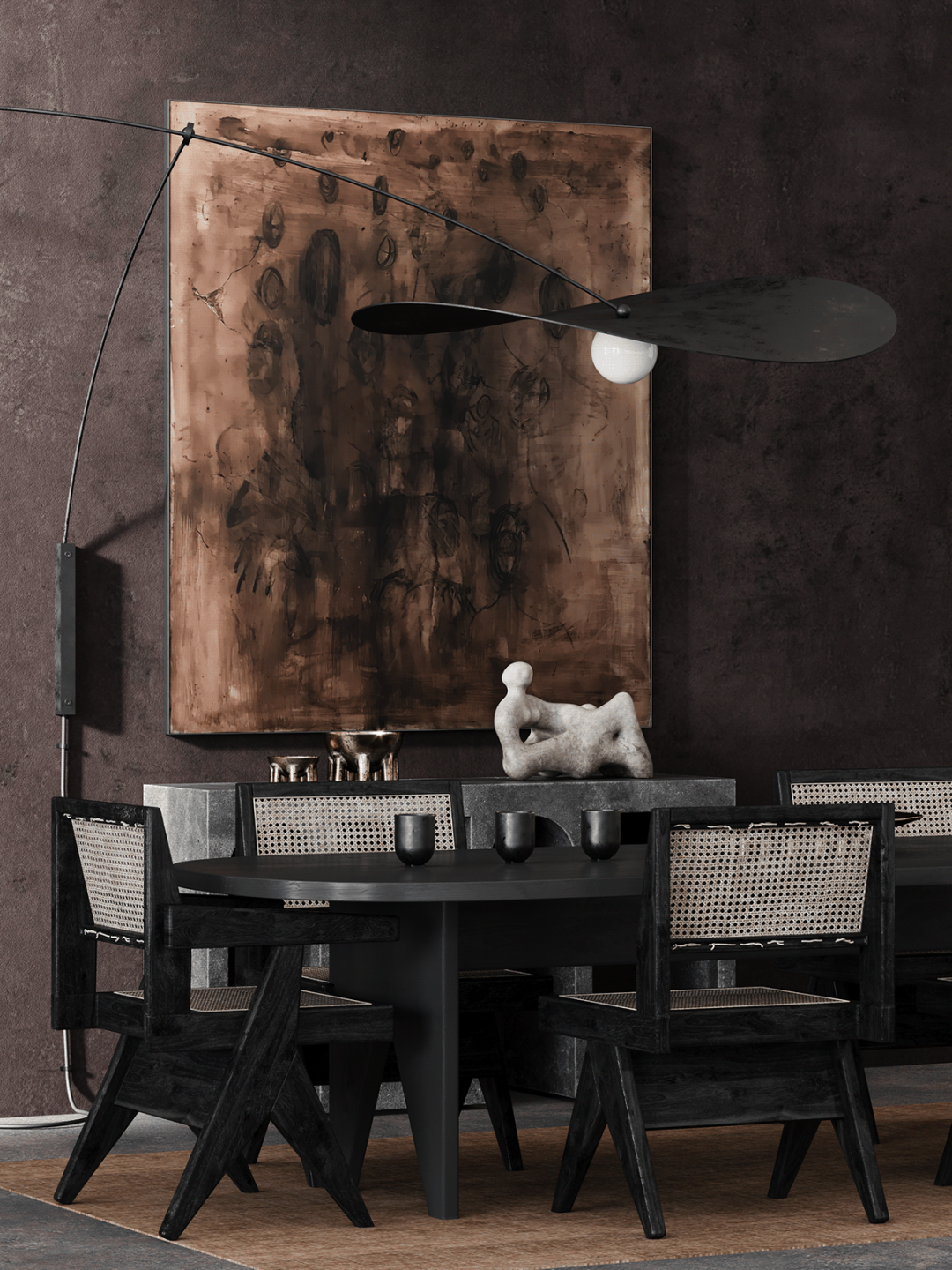 想将kelly wearstler控制台流畅圆润的线条与工作室椅子的粗犷直线相结合,赋予静态形式一种动态的感觉。用giancarlo valle工作室的浮灯,光滑的形状强调了这一切。