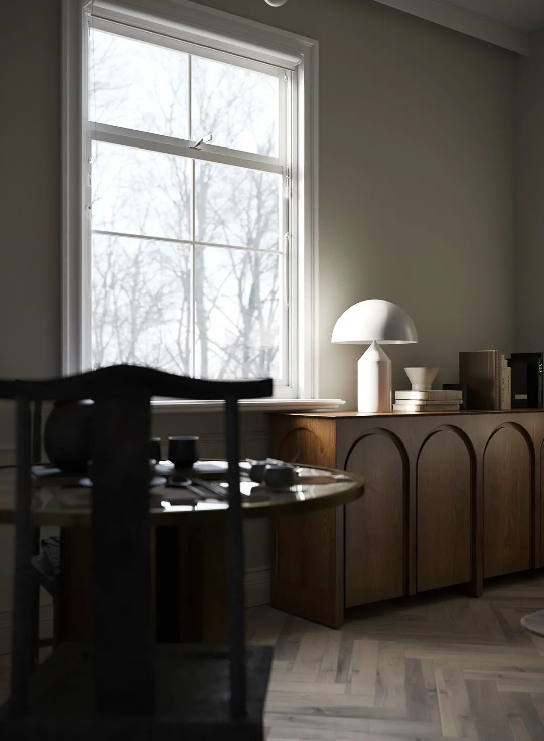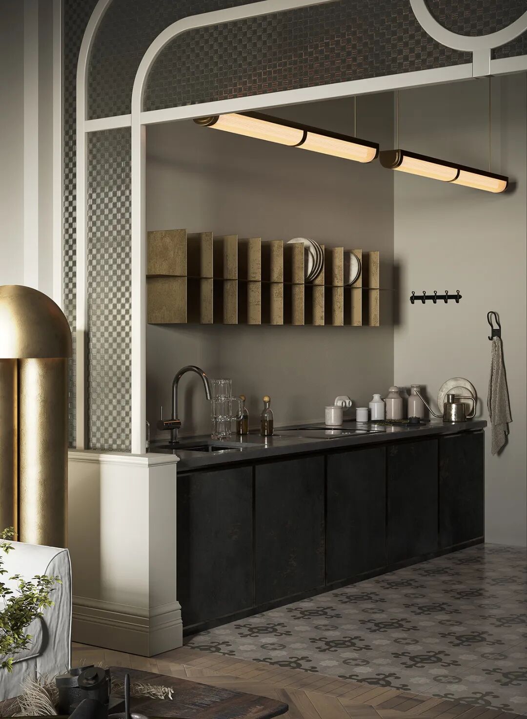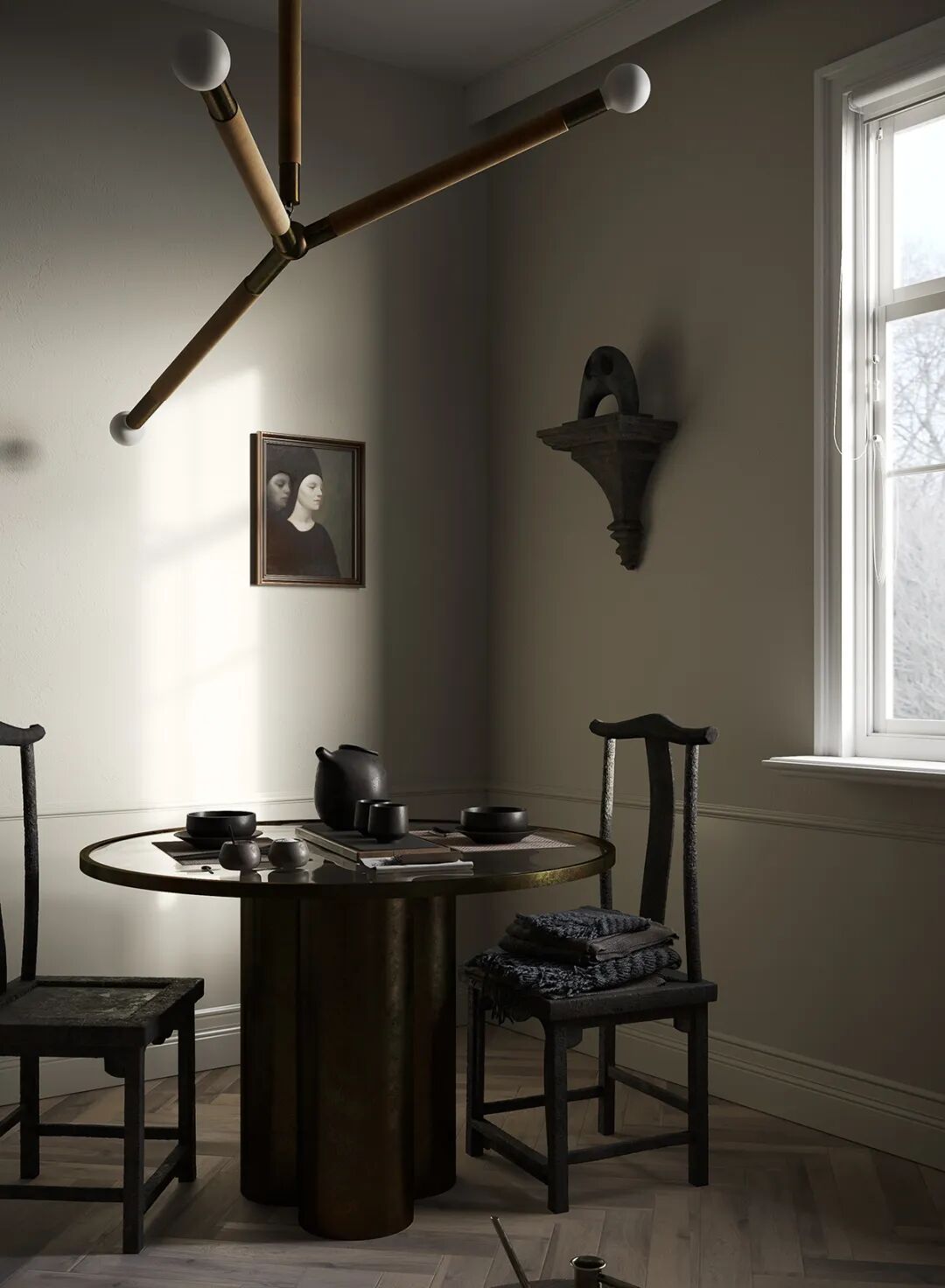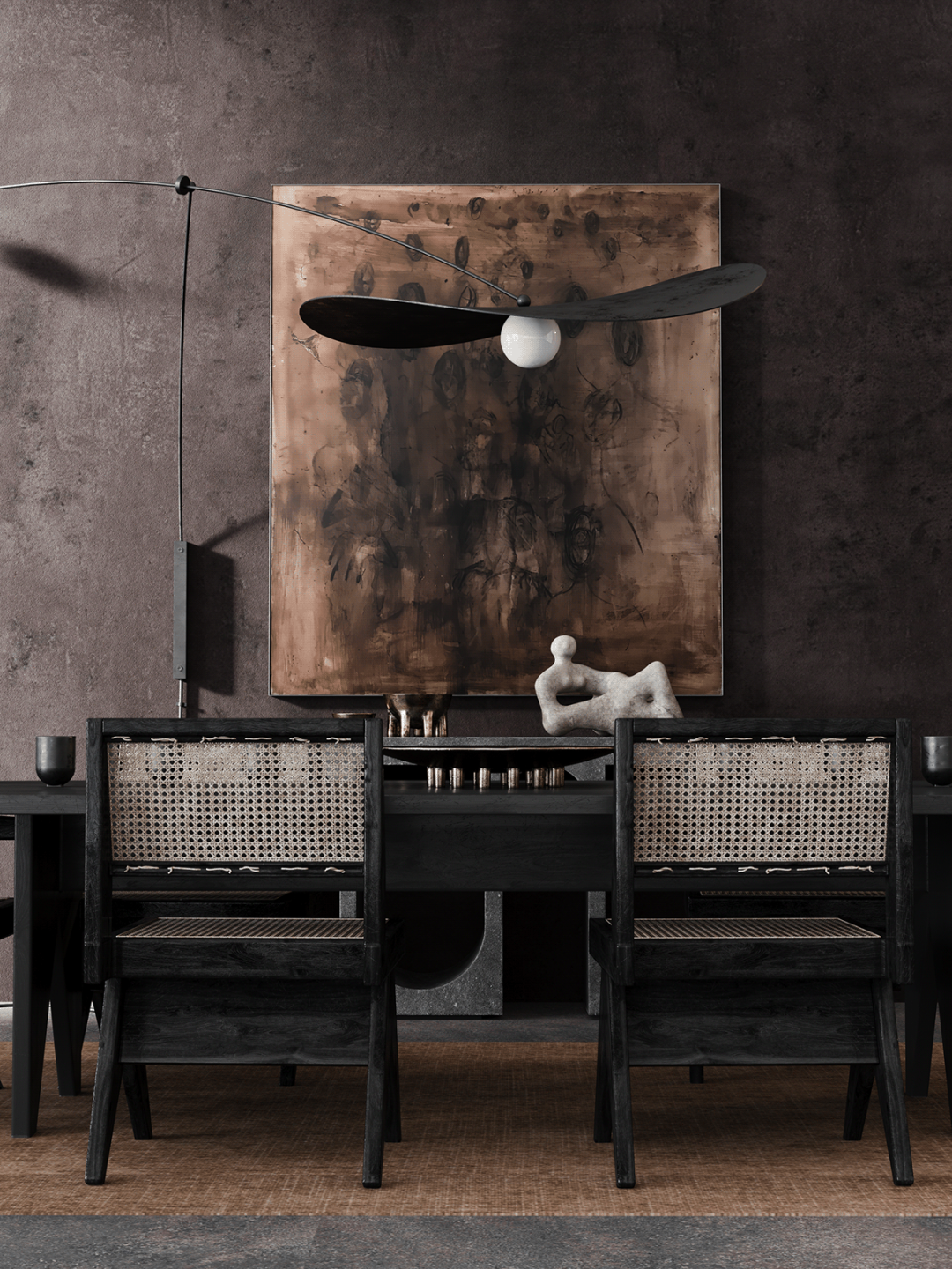想将kelly wearstler控制台流畅圆润的线条与工作室椅子的粗犷直线相结合,赋予静态形式一种动态的感觉。用giancarlo valle工作室的浮灯,光滑的形状强调了这一切。