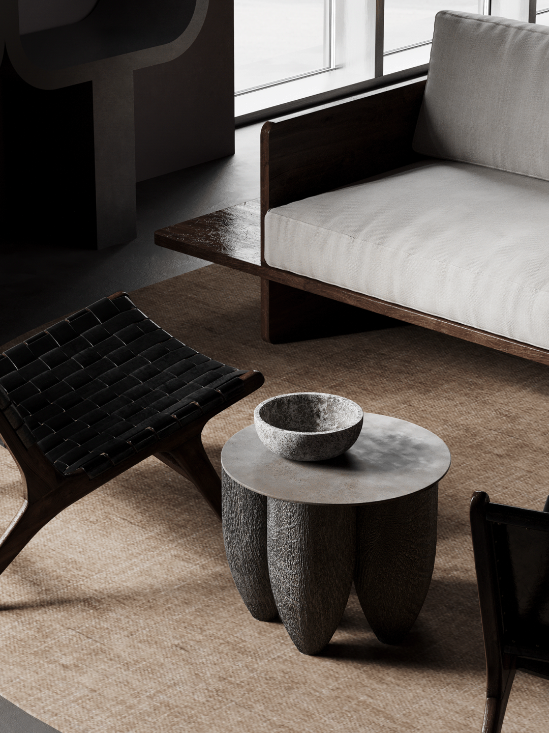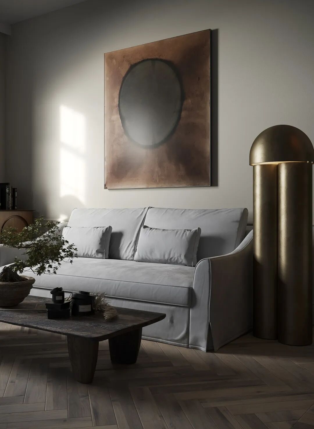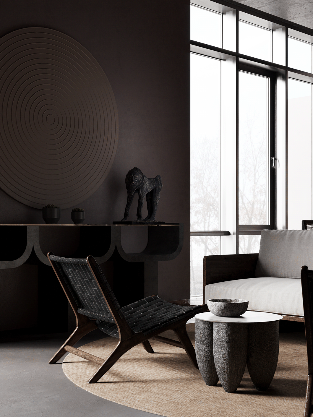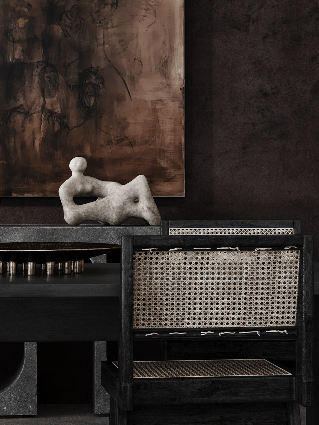 在室内使用各种雕塑和艺术品,尤其是抽象的形式,亨利摩尔的雕塑完美地适应了这些任务,并与室内装饰相得益彰,使其更加有趣。沙发的极简设计,结合天然材料,成为分区的理想选择。