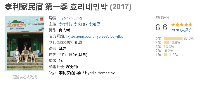 孝利家民宿一共拍了两季,豆瓣评分都在8.0以上。